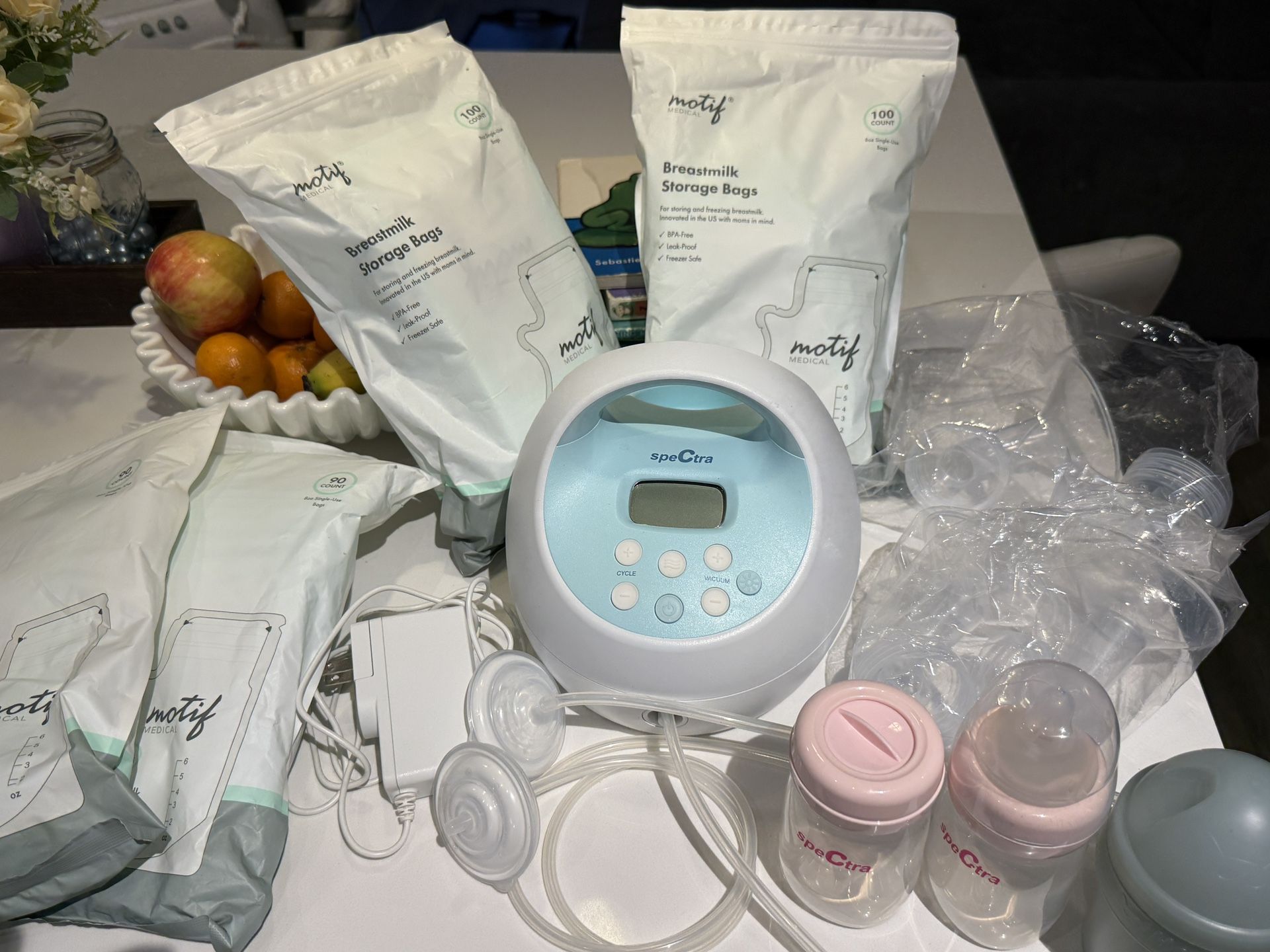 The blue spectra is rechargeable (can be used with or without wall plug) and in excellent condition. I used it only for a few months and a few times a day. You are welcome to all of the accessories pictured but obviously they need replacing. The only thing that hasn’t been used are the original Spectra flanges that came with the pump. I opened them simply to try and put the parts together (before I knew what I was doing). There are 2 unopened bags of Motif Breastmilk Storage bags and 2 bags that have been opened. One of the bags I opened by mistake which hasn’t been used and the other opened bag has been used.