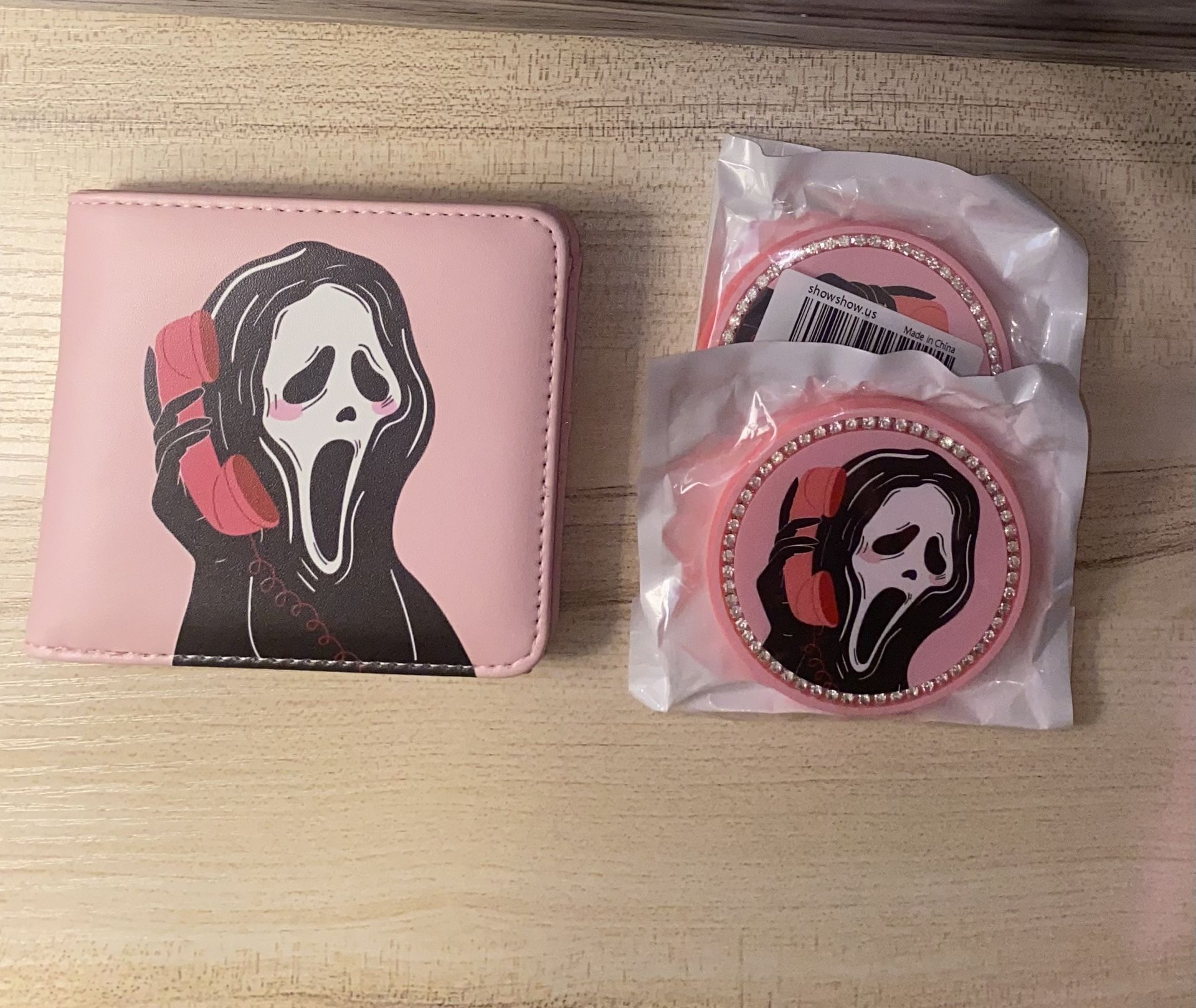 Both brand new. Pink Faux leather Bifold Scream GhostFace wallet and (4) matching ghostface coasters. Wallet is 5-inches in length and 4" in width