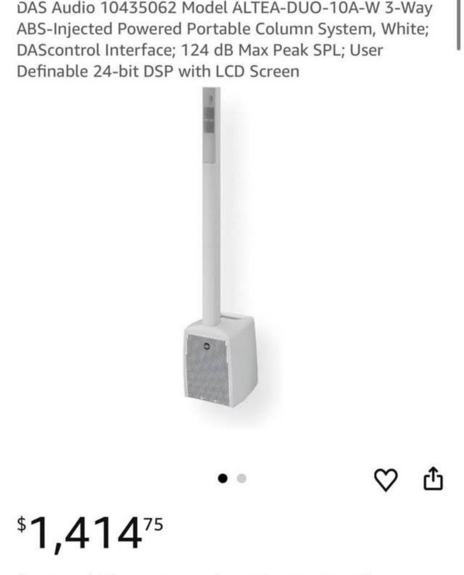 Open box to test but it’s brand new! Great sounding 3 way speaker! Retails for $1400 Altea duo-10A is a 3-way ABS-injected powered portable column system designed for mobile applications from corporate events, celebrations, and conferences to live music and more. Its two-channel Class D amplifier and universal power supply with 1000W peak power provides the power and dynamics that such an ultra-lightweight system requires. The DSP board incorporates DAScontrol technology with LCD display and a rotary knob for selecting multiple acoustic modes (presets) depending on how the system is used as well as access to other configurable options within the system’s menu. The DSP incorporates two independent mic/line inputs with their respective volume settings, plus a third instrument input designed for connecting keyboards, basses or guitars. Audio can be sent wirelessly from mobile devices and the entire system can be controlled with the DASlink GM app. The system incorporates a 10″ 10MG4 speaker developed specifically for low-frequency reproduction with ultra-low distortion levels via a powerful magnetic assembly and a cone suspension design with high displacement capability. To reproduce mid and high frequencies, the top system features two 3″ 3PN16 drivers with neodymium magnets and an M27N neodymium compression driver coupled to a 100º x 50º horn. The horizontal directional control of the system provided by the horn is highly uniform across the entire high-frequency spectrum (f>1000Hz) and the compression driver ensure that the highs are bright and defined.