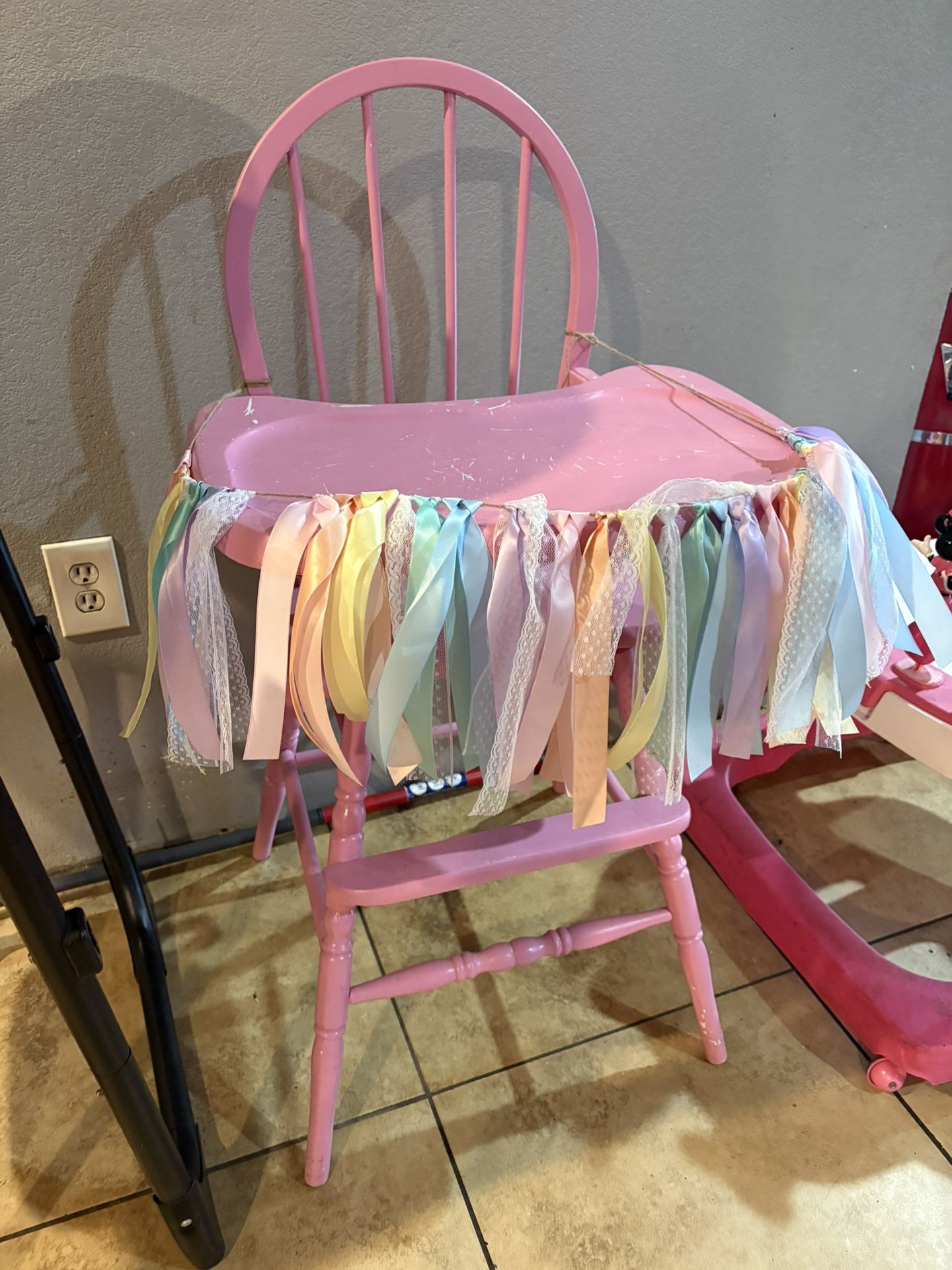 Pink vintage high chair used for my daughters 1st birthday it’s just sitting here taking up space. Paint is scraped off but you can repaint it