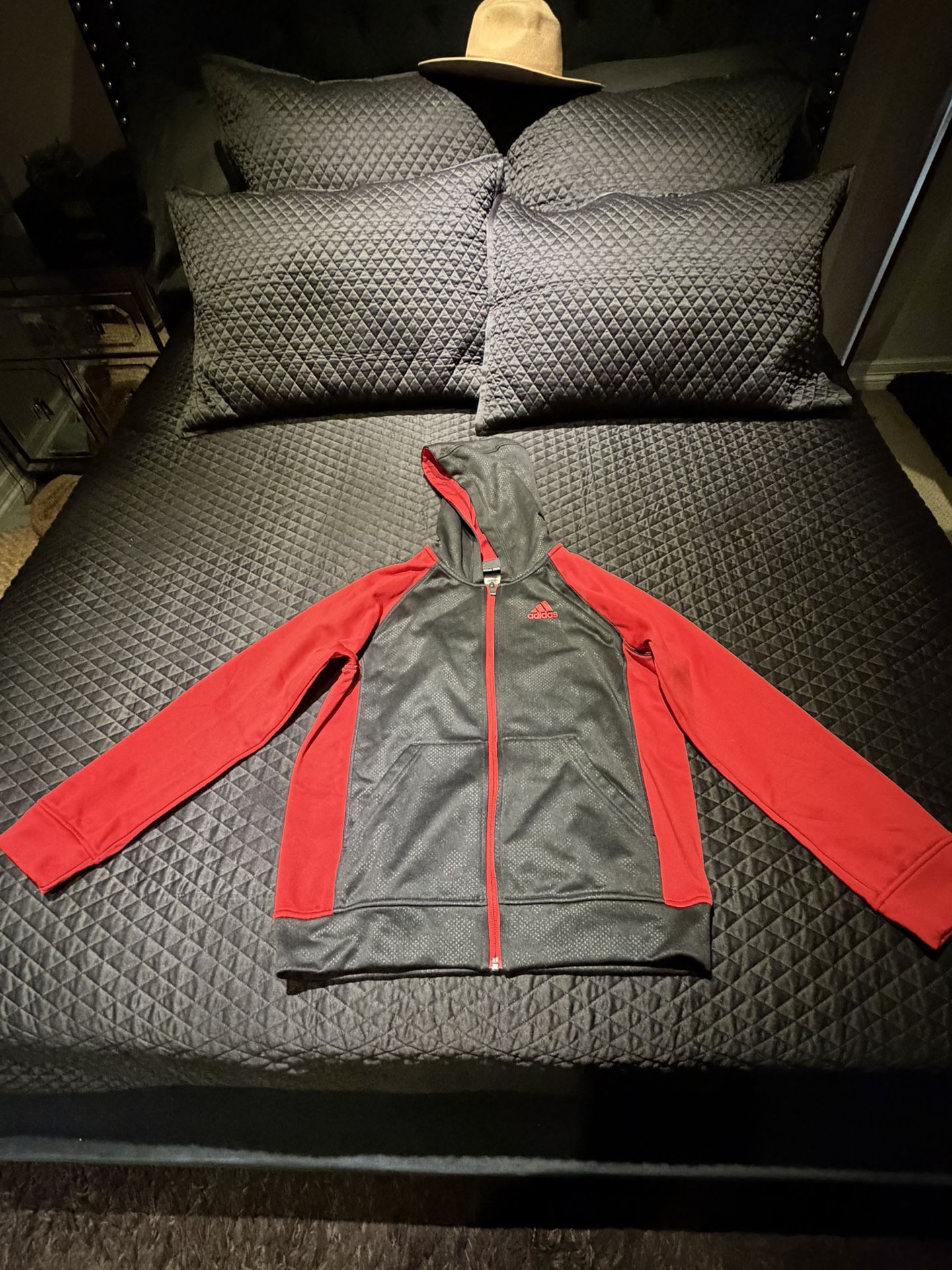 Stay comfortable and stylish with this Adidas youth full-zip hoodie in a bold black and red colorway. Perfect for sports, school, or everyday wear. • Youth Size Large (14/16) • Lightweight performance fabric (100% polyester) • Full zip front with hood • Front pockets • Breathable, moisture-wicking material • Great for training, soccer, gym, or casual wear Condition: Good pre-owned condition with normal wear, no major flaws.