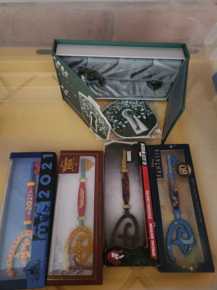 collectible keys and 1 pin, which are special edition keys released by Disney. 5 keys and 1 pin. Disney Collectibles Keys & 1 Pin (6 Pieces Total)