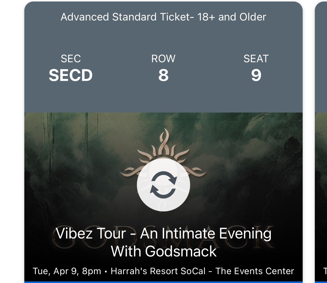 I have two tickets to see godsmack tonight at the Event center at Harrahs Resort SoCal . sec D, row am8, seats 9 and 10.
