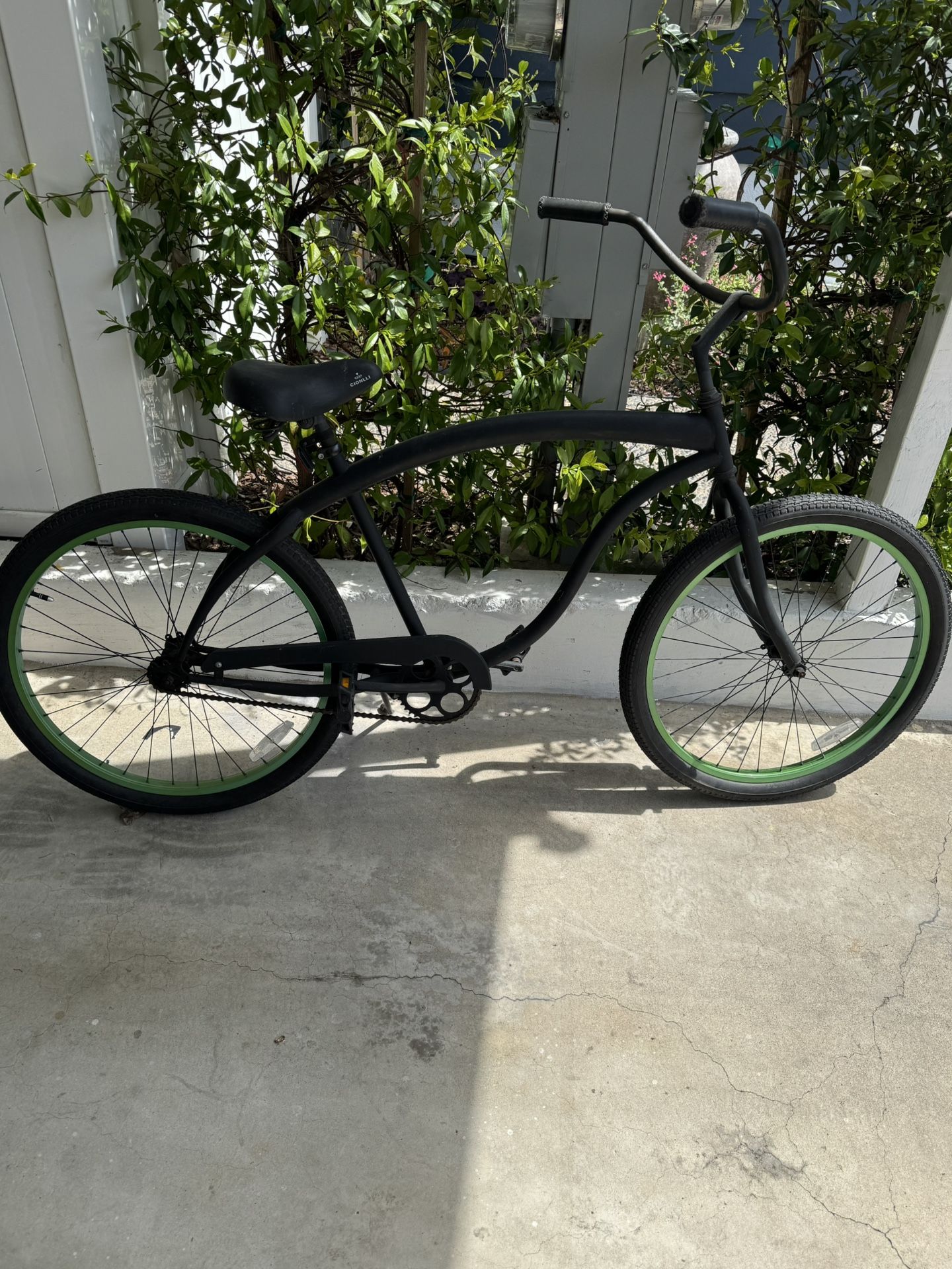 Single speed matte black beach cruiser with coaster brakes. Tires are in good condition with green rims. Perfect cruiser for the summer. Cash only. Must pick up