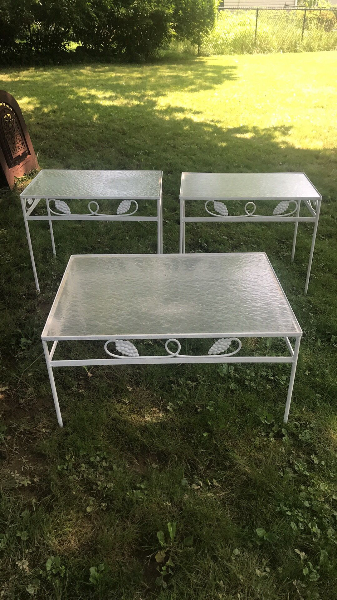 Coffee table 31 x21 x 14 1/2 plexi glass 2 end tables 24x16 1/2 x 19 1/2 - textured glass Grape vine pattern