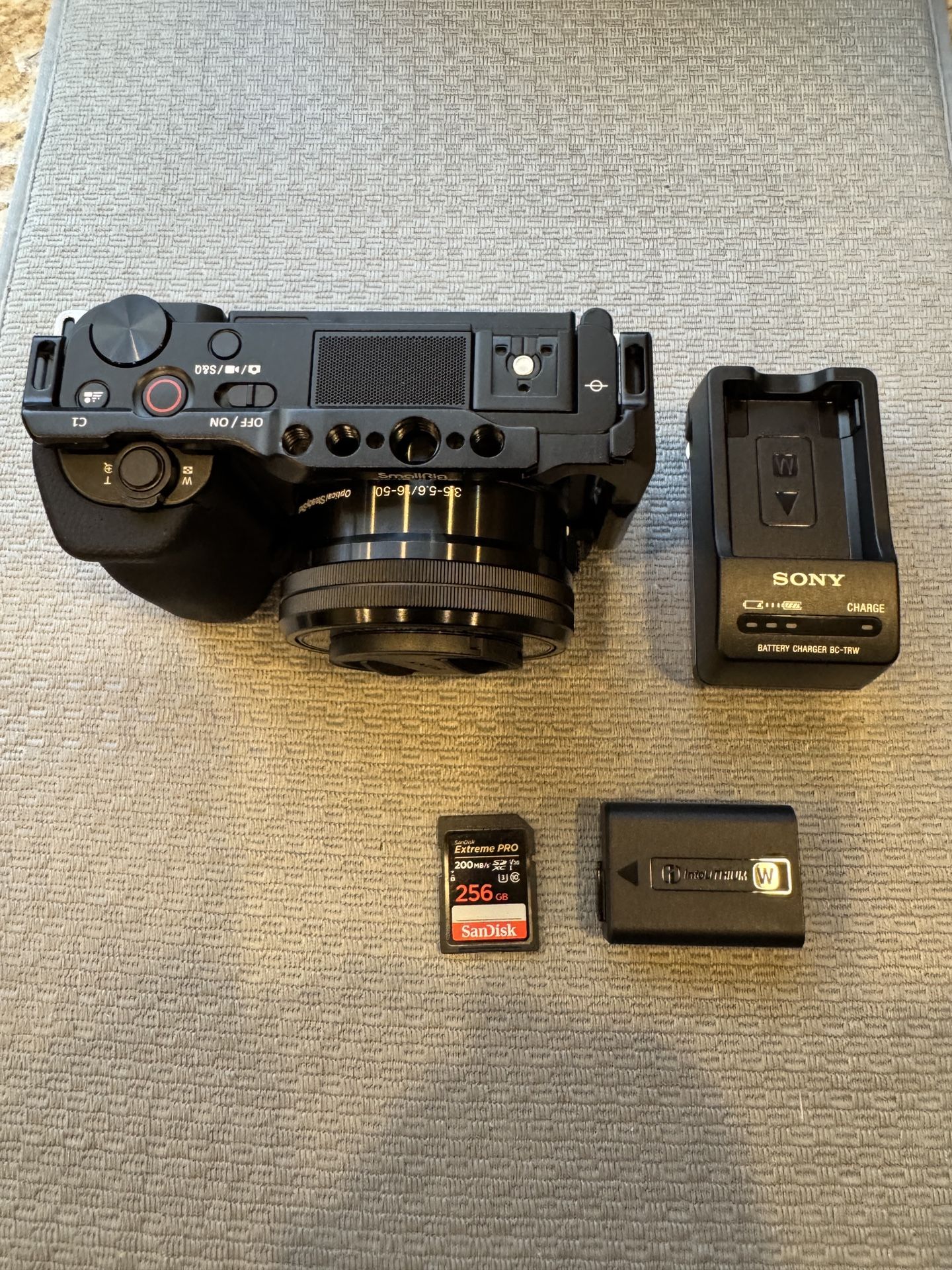 No box but includes battery, charger, 256GB memory card and Small Rig cage. Never used, never had time. Shoots 4K video. Includes the Sony E PZ 16-50mm f/3.5-5.6 OSS II Lens. Articulated screen. Mint condition. Can charge battery in camera with USB-C cable. These are running $700 to $800 online. $600 cash, no trades or payment apps. Available for pickup on Beacon Hill in south Seattle most evenings and weekends.