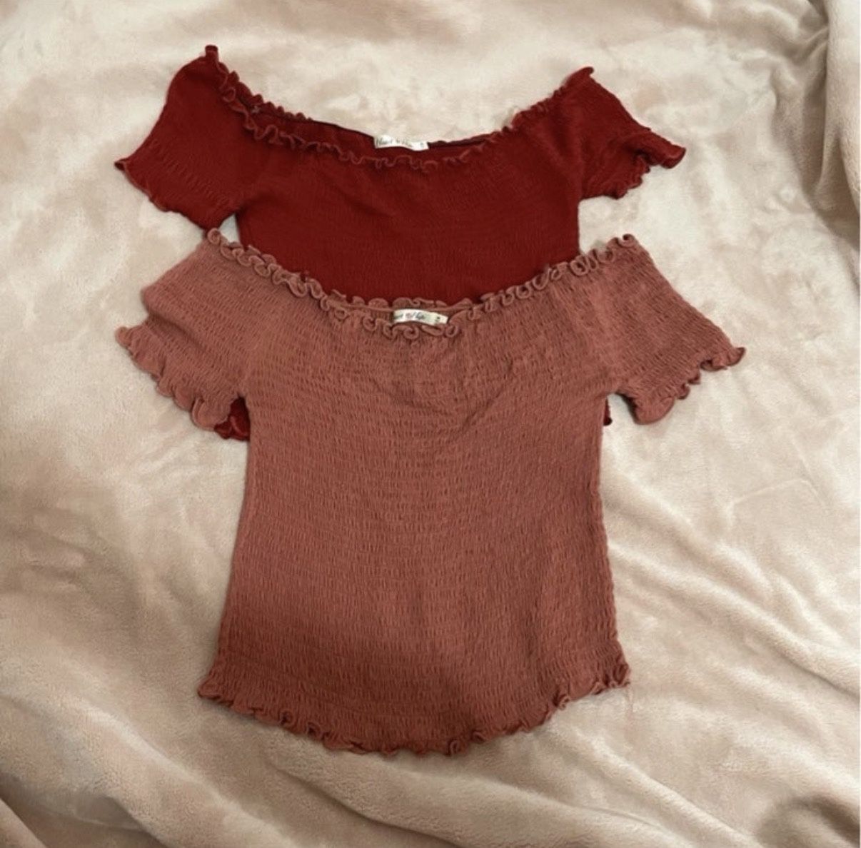 Off The Shoulder Smocked Ruffled Cropped Tops Red Pink Mauve Crop Bundle