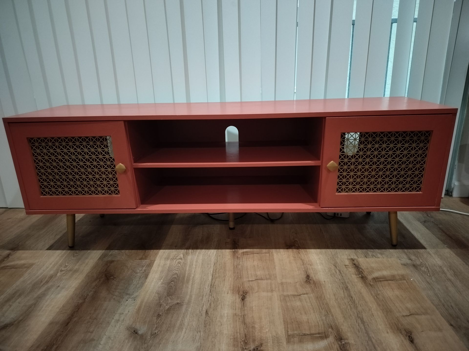 Dark orange tv/entertainment stand with gold hardware, light wear and tear (see photos). Dimensions: 59"L, 15.5"W, 21"H