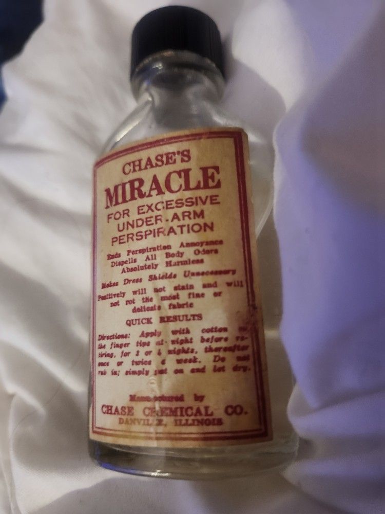 This is a vintage bottle of Chase's Miracle for Excessive Under-Arm Perspiration, an antique antiperspirant product manufactured by the Chase Chemical Co. of Danville, Illinois