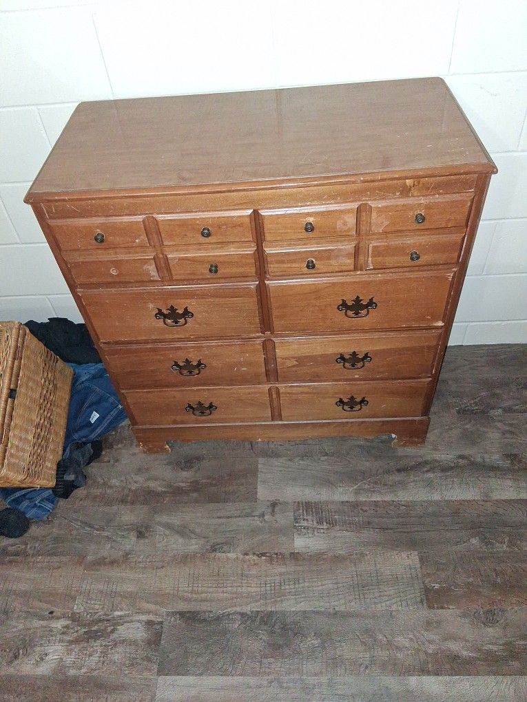 This 6 drawer dresser for smaller drawers. 2 large drawers is a very nice dresser. It's only missing one knob of the language in fairly great shape. Almost like new few scratches here and there. But otherwise and relatively good shape, still definitely in great condition holds close no problem.