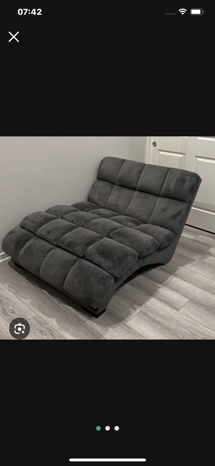 Darker Grey 2 person chaise lounge Almost like new Great for family rooms or reading chair Solid, durable, comfortable 44.5" wide 63" deep 33.1" tall