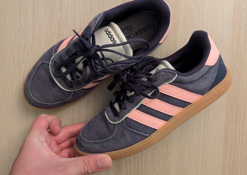 Brand New Adidas Women's Breaknet Sleek Suede casual sneaker in the Shadow Navy, Pink Spark, and Off White colorway with a gum sole in a size 7, thanks for looking