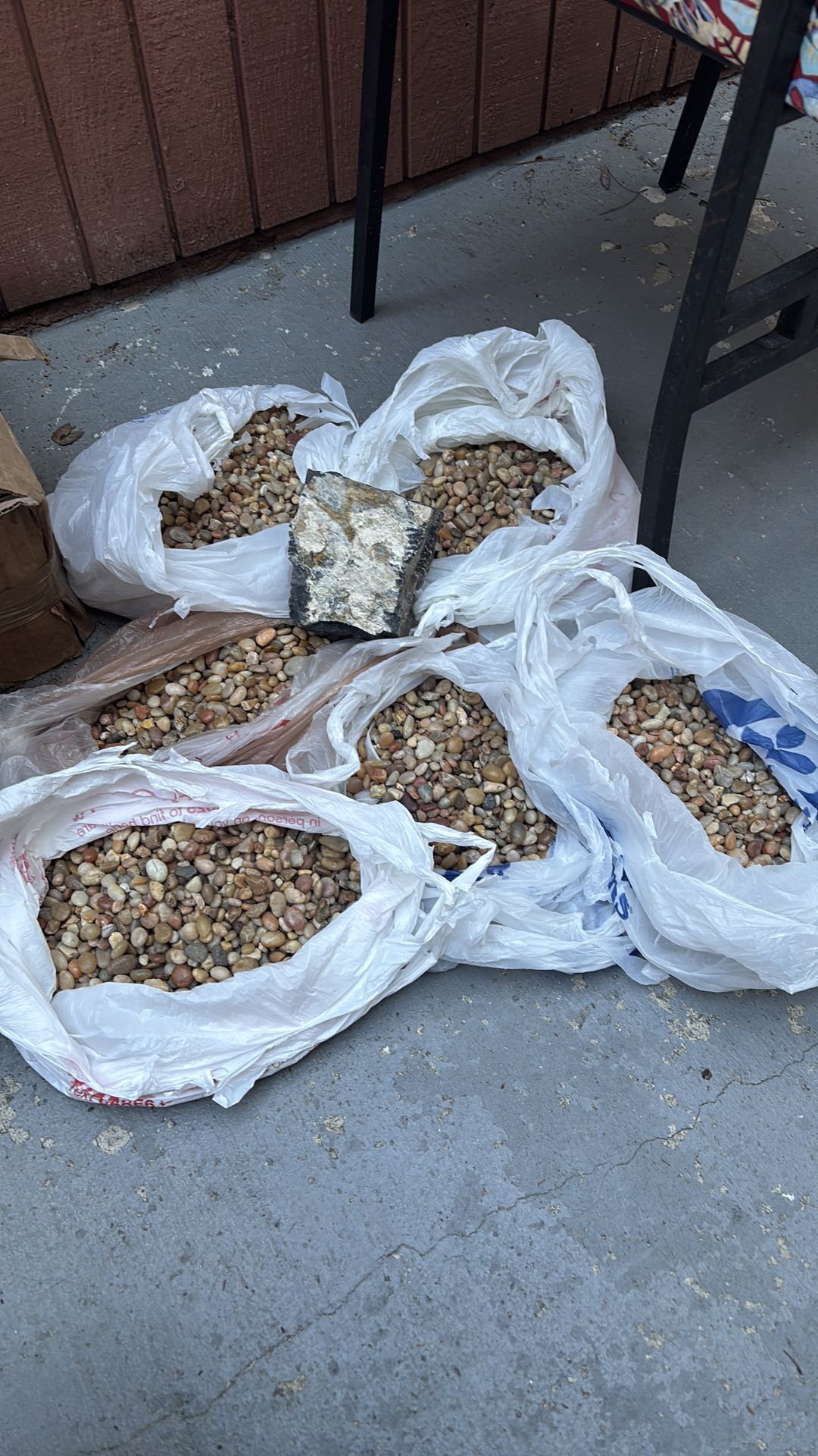 Earth-tone aquarium rocks and one large rock. Don’t have a weight or volume but we used them to fill a 40 gallon tank. Pick up only.