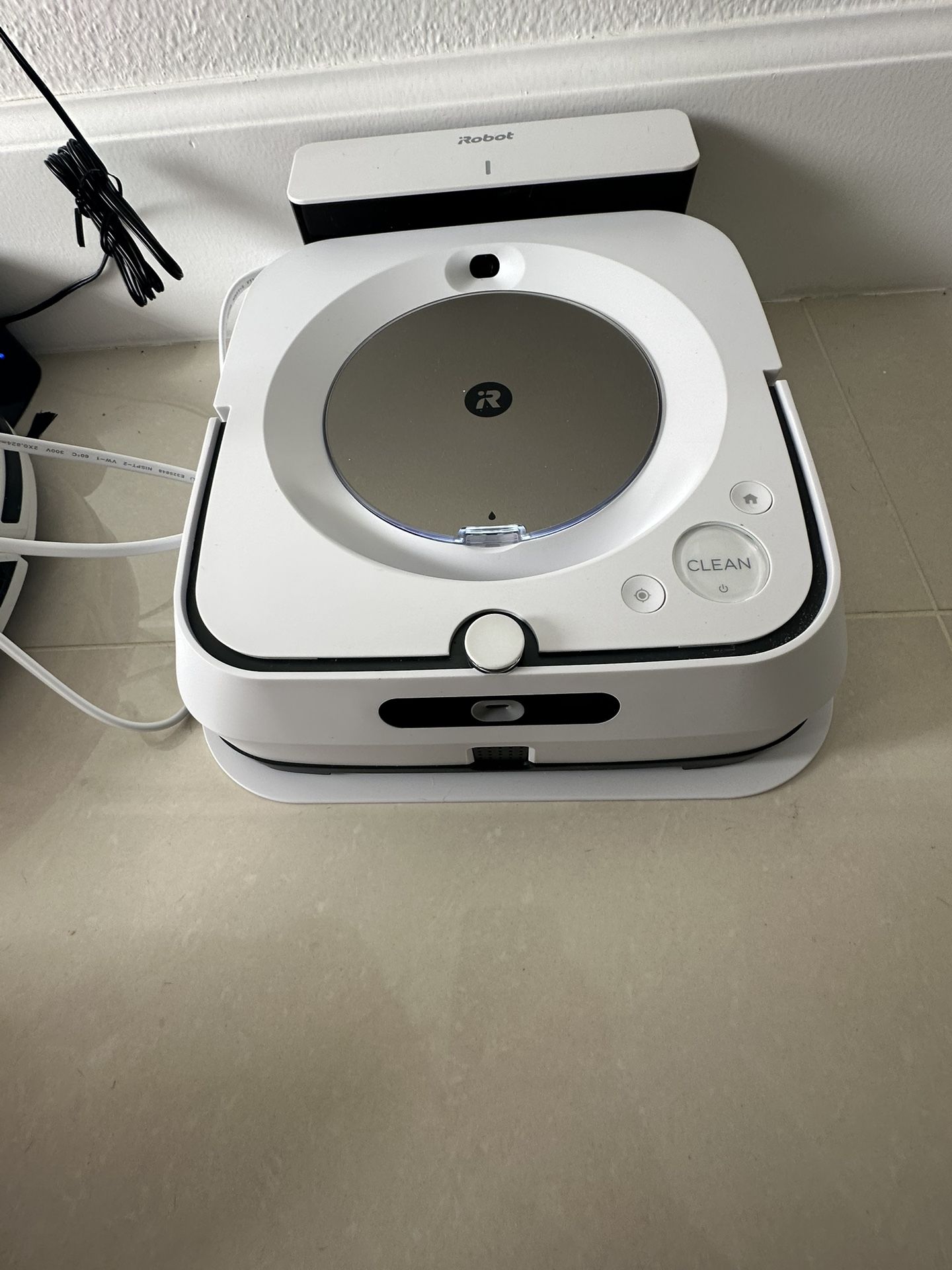 New bra a m6 used twice unfortunately my dogs are not fans of it. Works great comes with box and some extra mop and sweeper pads