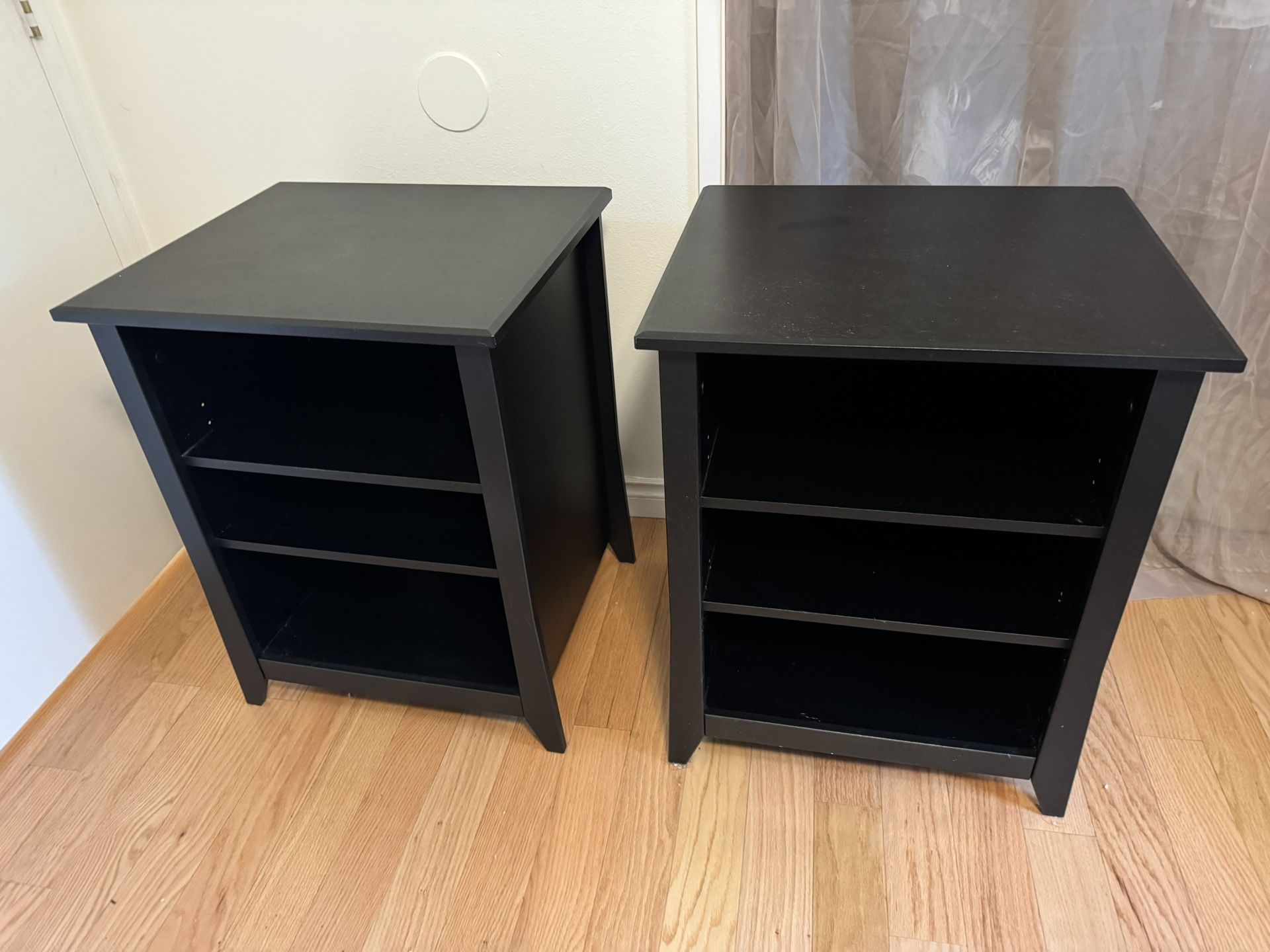 These are some quality black speaker tables that we use as side tables, but have used them to hold our speakers. They have a black backing with a couple of cut out holes in the back(of one) for cords to go through. 24in W x 21in L and about 31in tall Excellent condition. $60 for the pair. Cash only, pick up only Moving and downsizing or I’d take these beauties with me.