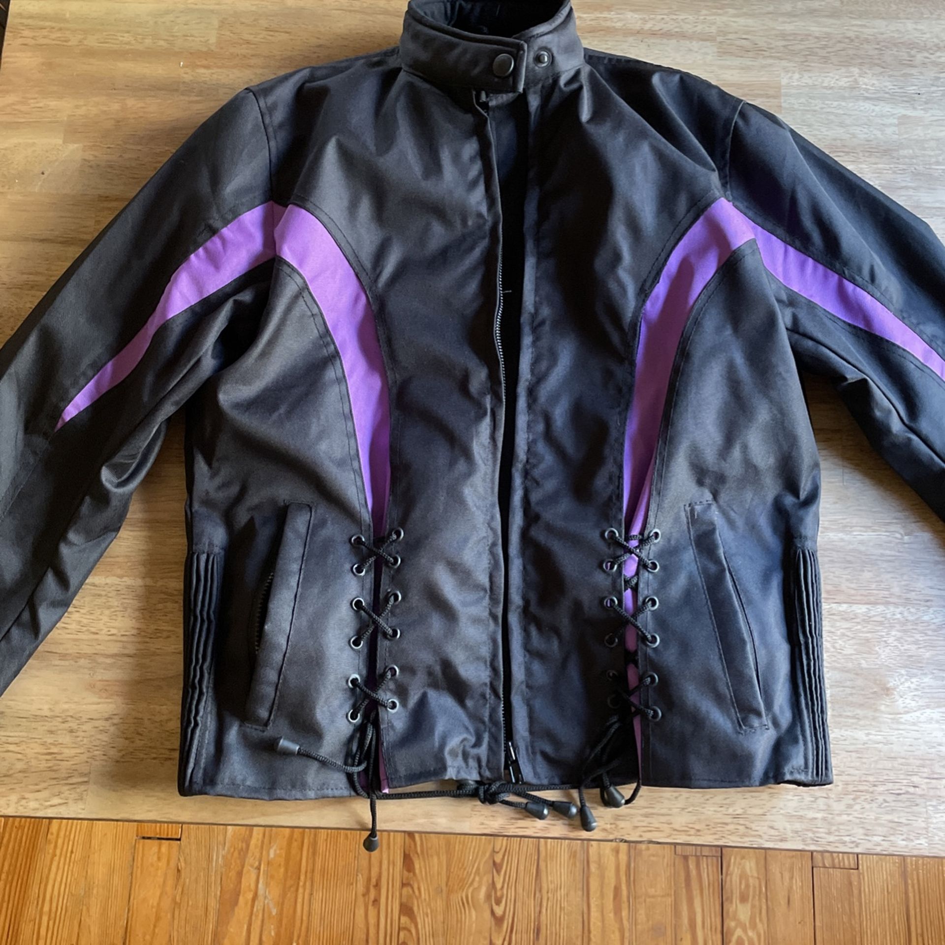 Purple and black draw string ladies riding jacket. Many pockets. Never worn.