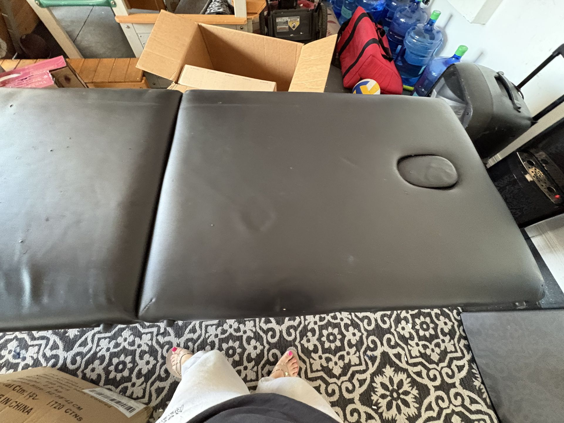 Massage table for use of massage lashes etc for a beginner stylist some small holes in the leather due to hot wax massages other than that it’s very minimal. Typically users will put a type of towel or cover small cosmetic issues