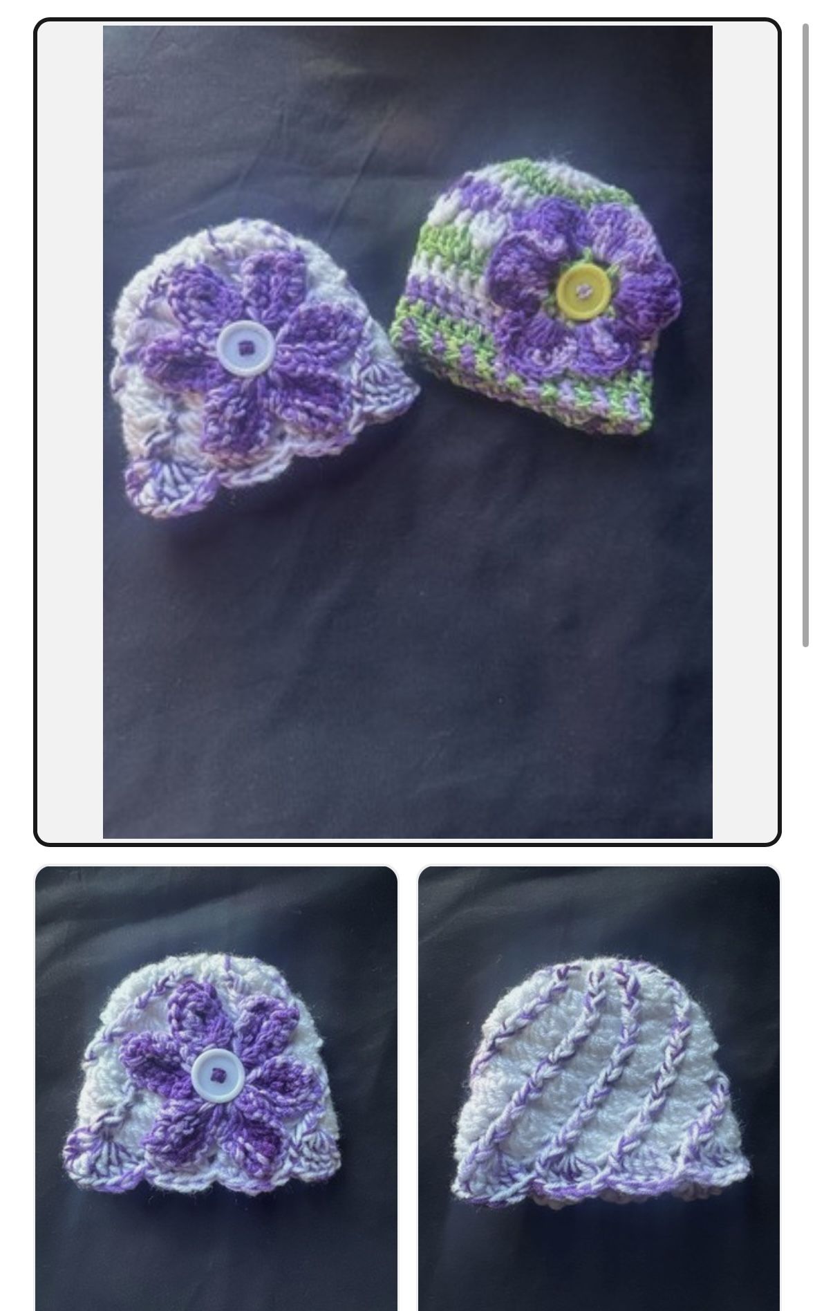 This darling set crochet preemie hat duo in preemie/ newborn size features a beautiful floral design with purple hues and other accent colors, making it a perfect accessory for a baby girl. The beanie style with flower theme and colorful design is ideal for winter, fall, and spring seasons. Made from an acrylic blend fabric, this hat is perfect for baby showers and adds a cute and stylish touch to any outfit. Made in a smoke free environment. All sales are final with no returns. Handling care instructions best to hand wash and air dry. All buttons are securely fasted. However parental supervision is advised.