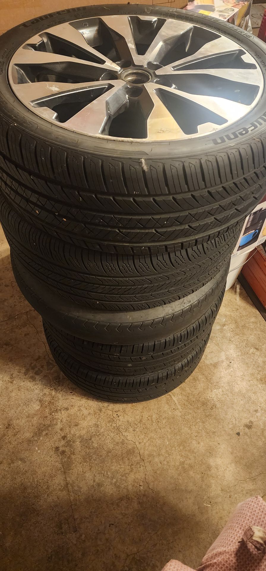 Stack of spare wheels from 2017 Nissan car. A spare donut A full size spare Some with black rims * no full set A couple have good tread. I just need gone out of garage. $150 takes all