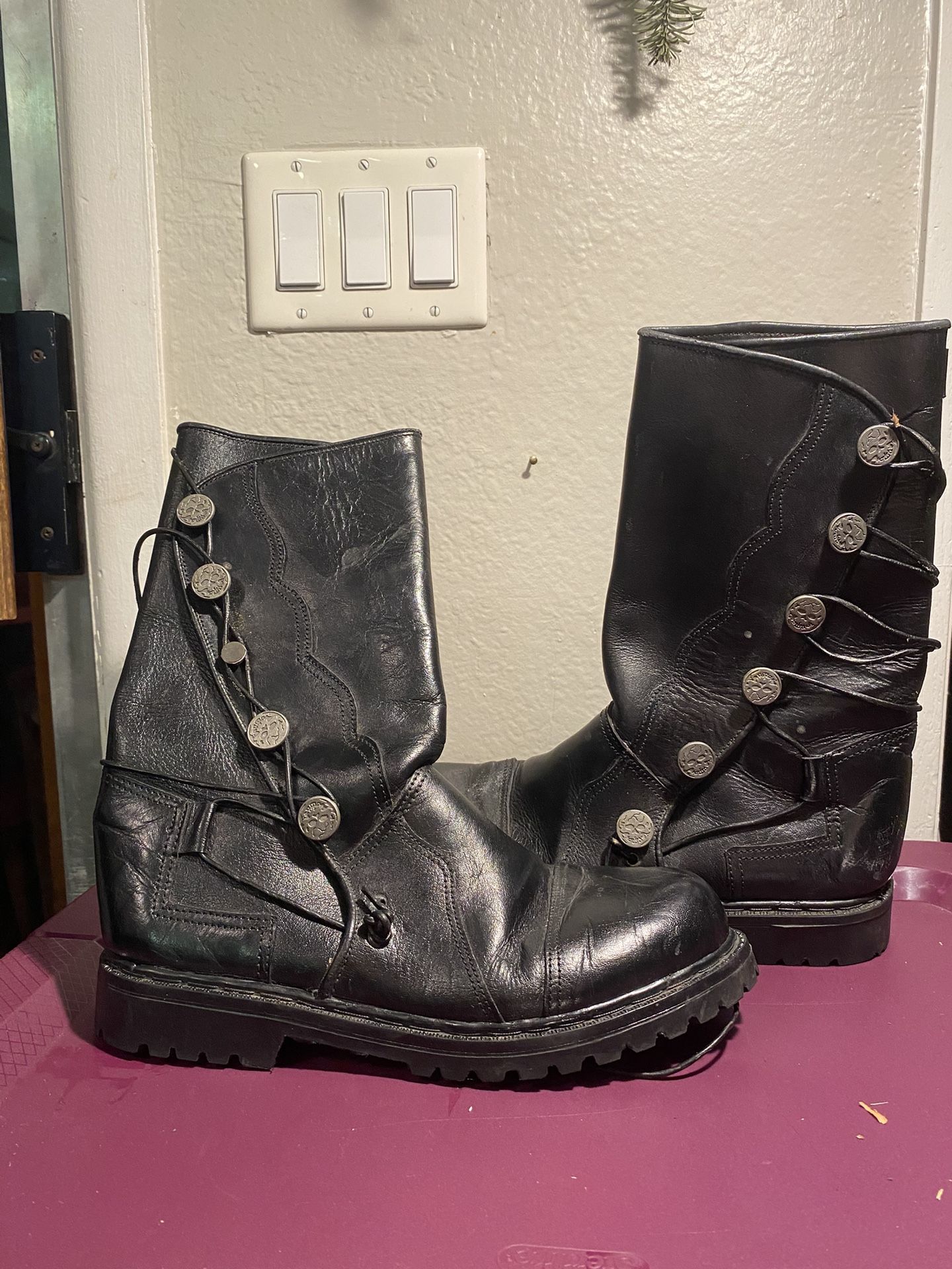 Stylish and durable black leather men's boots. Perfect for the Renaissance or Pirates Festivals or Cosplay! Missing one knob, and missing design on another knob. Will need new laces as well. Worn for a Renaissance Festival a couple years ago, but still in great condition other than the knobs/lace! Located on Mountain Vista & Sunset, in Henderson. Can deliver for gas.