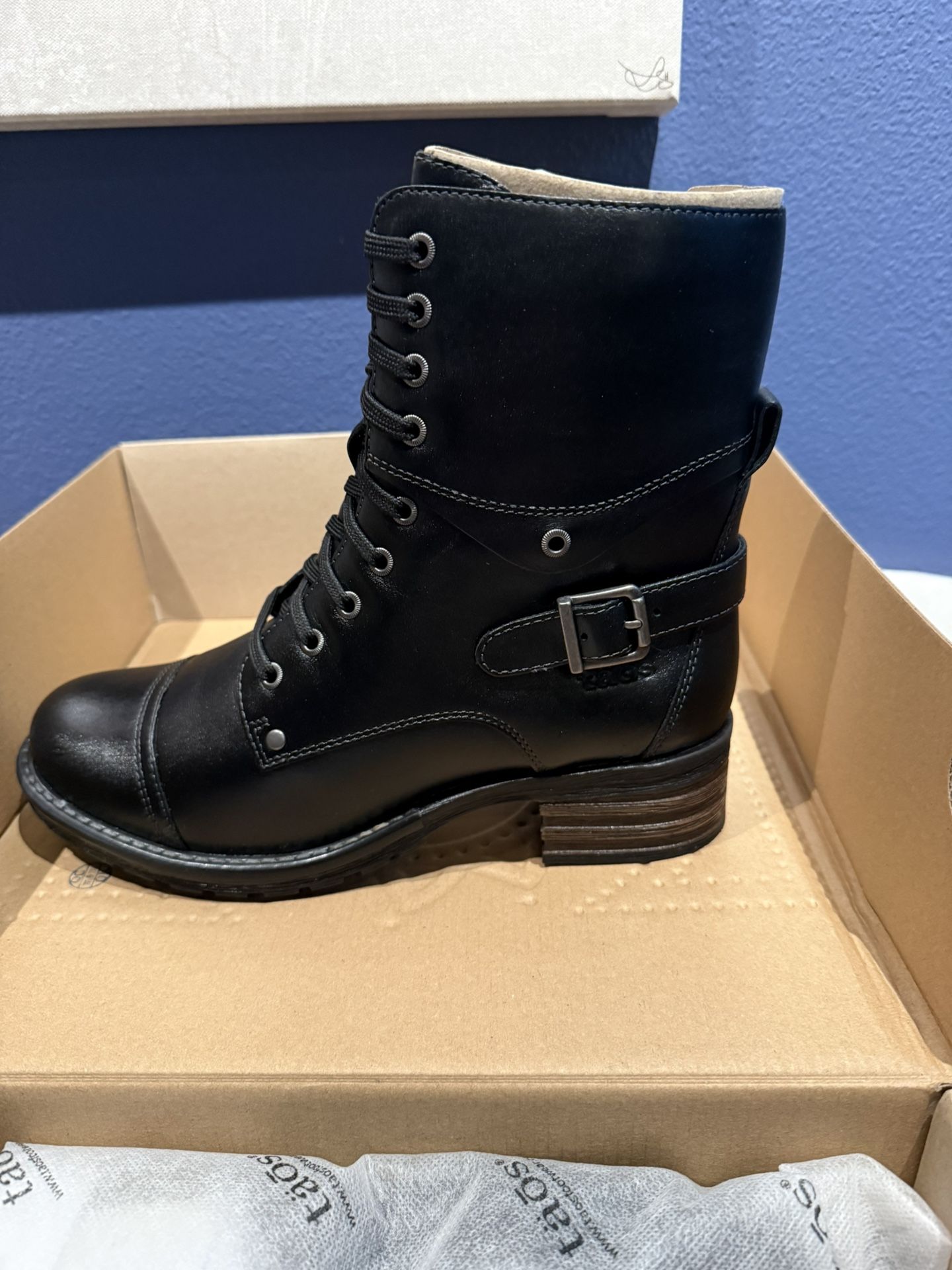 You are viewing a brand new pair of Tao’s boots. High-end quality, leather brand new never used. Very cool boots.  Unfortunately, I missed the return window and they are not my size because I did not know how to size European. Details: Size 39 wide European Arch Support & Metatarsal Support Boot Circumference - 10" Boot Shaft Height - 6 1/4" Care Instructions - Buff with a leather cleaner or polish. Wipe off with a dry cloth. Footbed Lining - Leather Forefoot Cushioning Heel Height - 2" Inside Zipper Leather and Faux Fur Lining Orthotic Friendly Outsole - TR Upper Material - Full Grain Leather Weight Per Shoe - 16.8 oz
