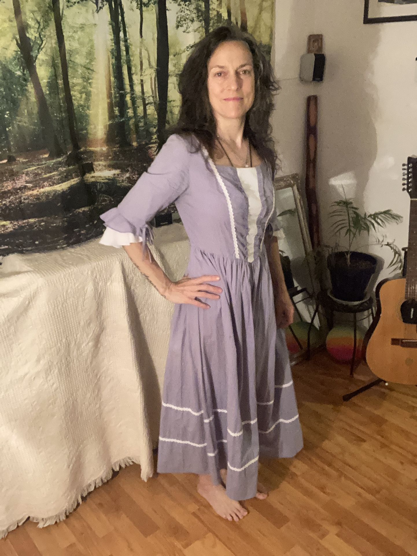 Comfortable dress with seamless zip and attached cotton belt tie from the sides that ties at the back. As new. Good for everyday wear, or for cosplay, roleplay or whatever you choose. Light blue in colour with white trim. 98% cotton Size ladies medium.