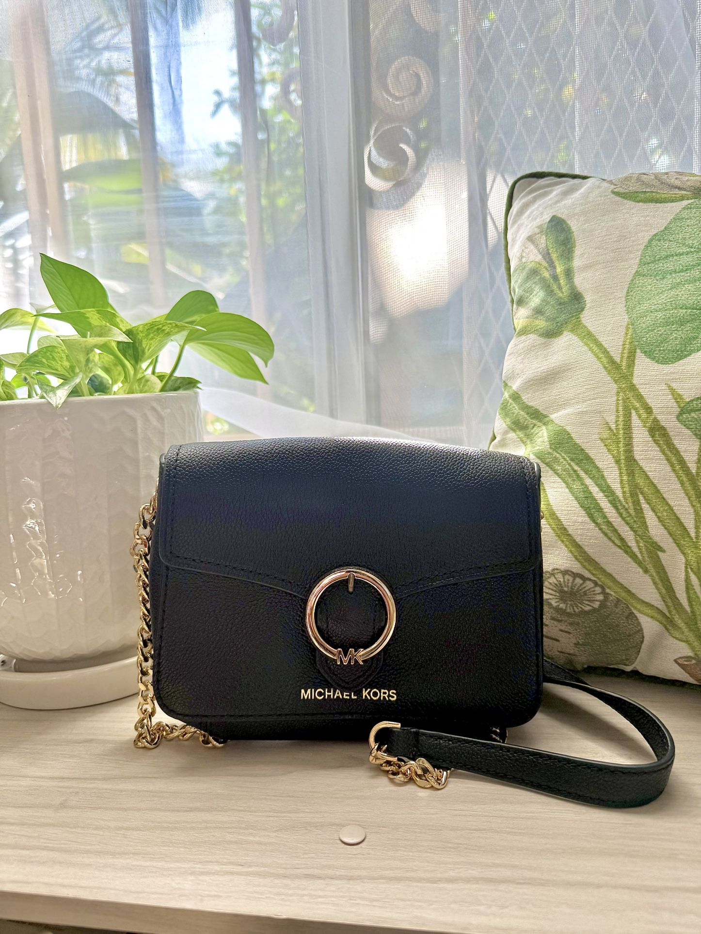 Brand new black Michael Kors crossbody bag with pebbled leather and gold hardware. Has a flap closure with a gold ring and a chain strap. The interior is lined and has a pocket. Never used, still in great condition.
