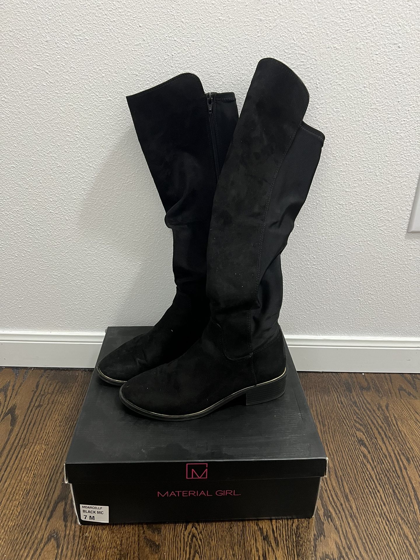 Material Girl Women’s Black High Knee Boots Size 7 w/ OG Box. Used condition. See pics for condition. Color: Black Women’s size 7 **********OPEN TO FAIR OFFERS********** FEEL FREE TO SEND ME A MESSAGE OR OFFERS :) Comes from non-smoking and pet free home. Ready to ship out next business day!!