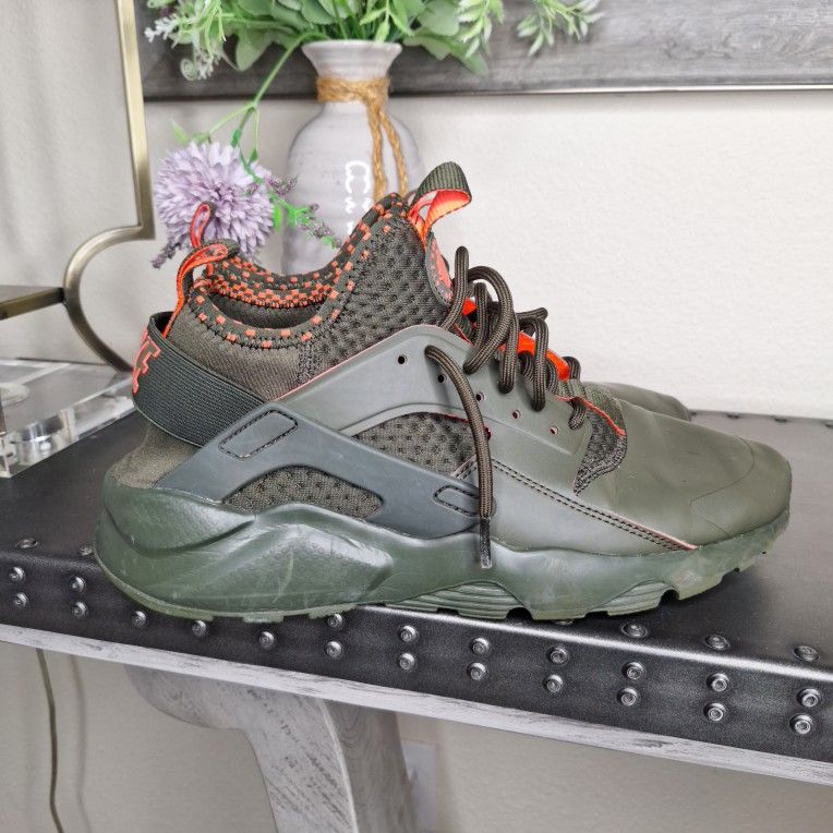 Nike Air Huarache Run Ultra SE en la combinación de colores Cargo Khaki/Total Crimson. Este modelo se caracteriza por sus tonos verde oliva con detalles en naranja brillante, y fue lanzado originalmente en 2017.