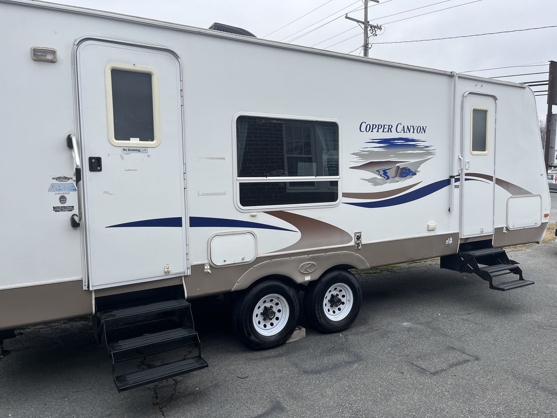 2007 Copper Canyon By Keystone 27RLSE power slide out trailer is in good condition in and out no leaks no issues floor is solid. Everything works as it should brand new tires and battery AC heat works all appliances work as they should. It is a double door unit plus an outdoor shower I am asking $4700. (contact info removed) located in Edgewood Maryland 21040