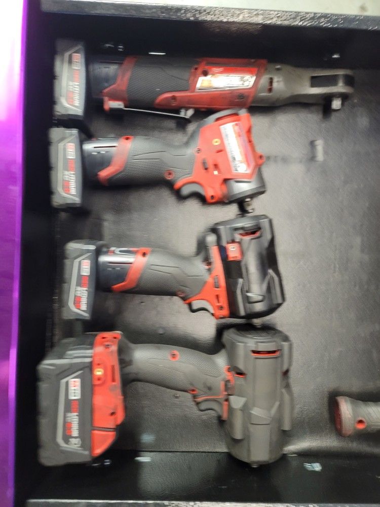Hello I have up for sale some Milwaukee impacts and ratchet all come with batteries the m18 is 1/2 in mid torque and the m12 are all 3/8 I am looking to get 480obo