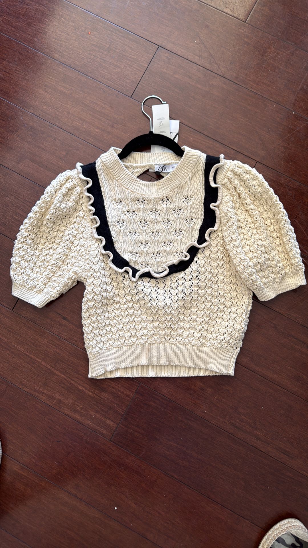 this short sleeve allows has knitted material and adorable ruffles in the front and his back out.
