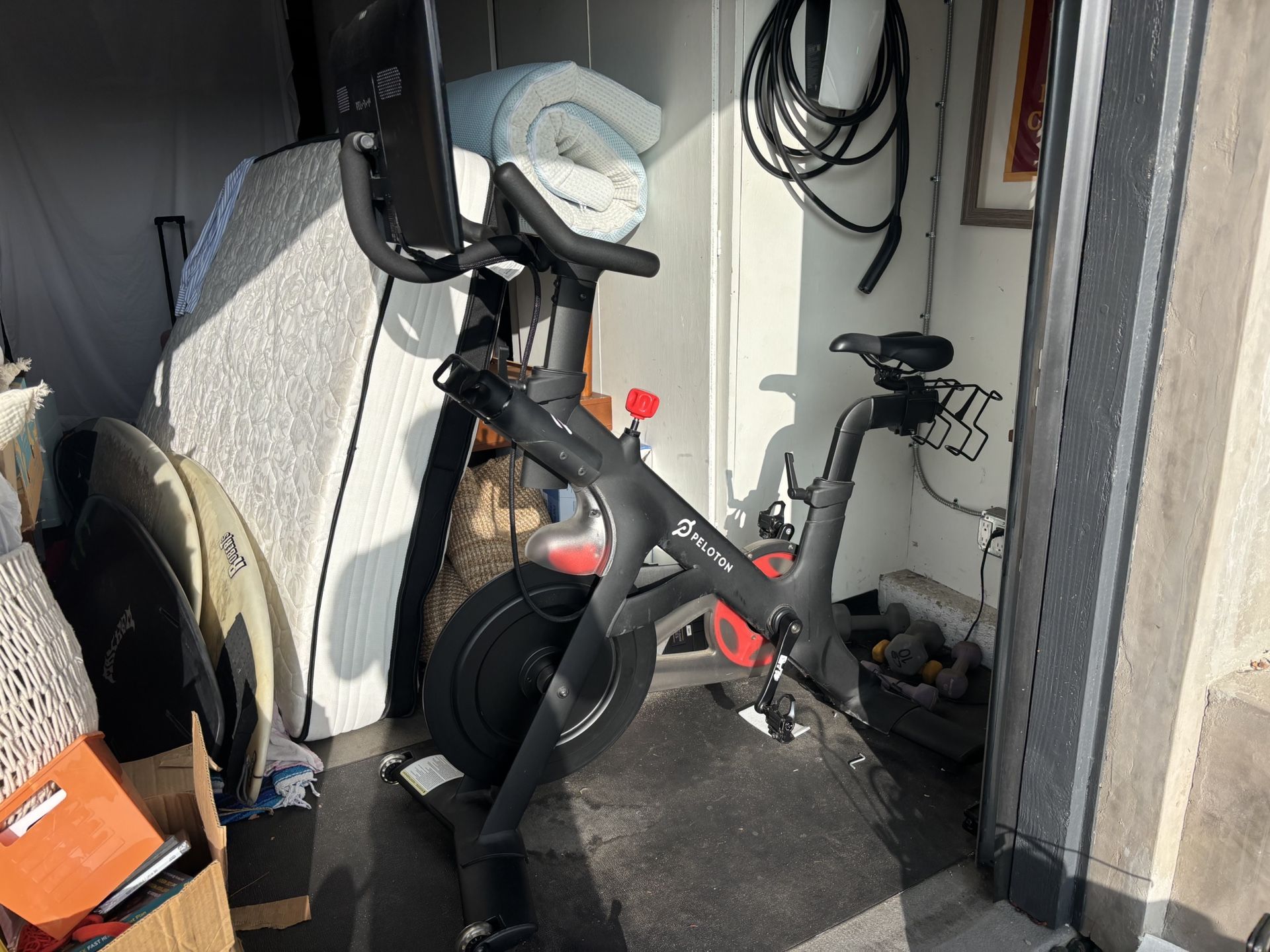 Peloton for sale. Used but in great condition. Includes two pairs of biking shoes (sizes 37 & 44) + one toe cage (any shoe fits in this). Two pairs of weights (2lbs + 3 lbs). 1 floor mat. And 2 water bottles. Message with any questions