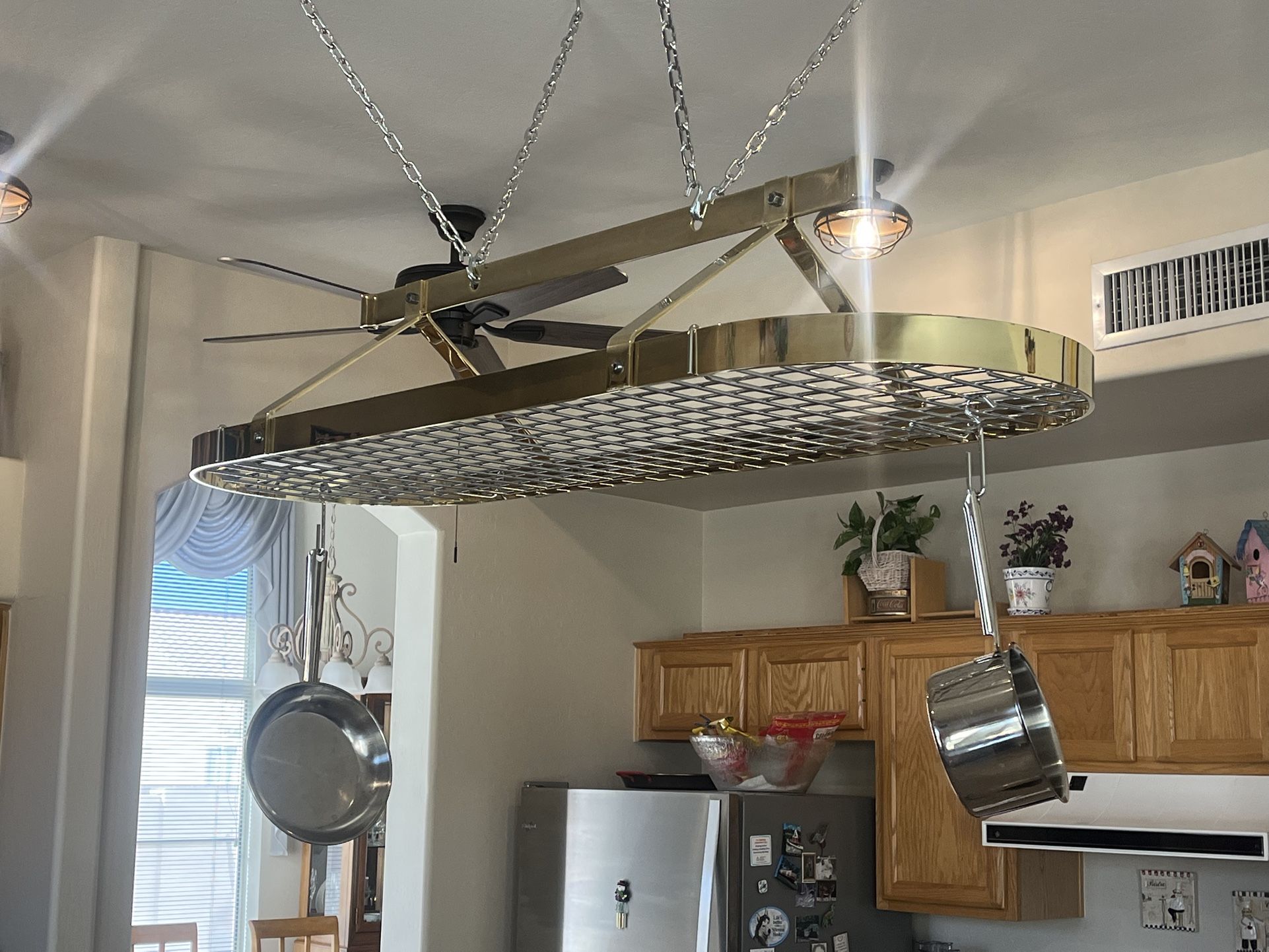 Enclume cookware rack brass finish #PR16a oval cookware rack 59”L x 20”W x 11”H Chrome grid and 6 grid brackets 4 chrome/ 20 brass pot hooks Chrome handing chain 25” long each Nice used condition