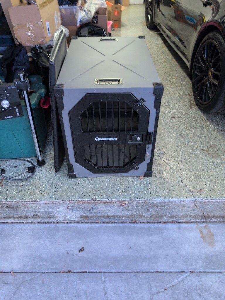 Rock Creek Crate (barely used): 36x23.5x27 dimensions. Purchased for GSD puppy that simply out grew it too fast. Ready for new home. Mid-sized to small breed dogs. BEST CRATE ON THE MARKET. Indestructible mat included.