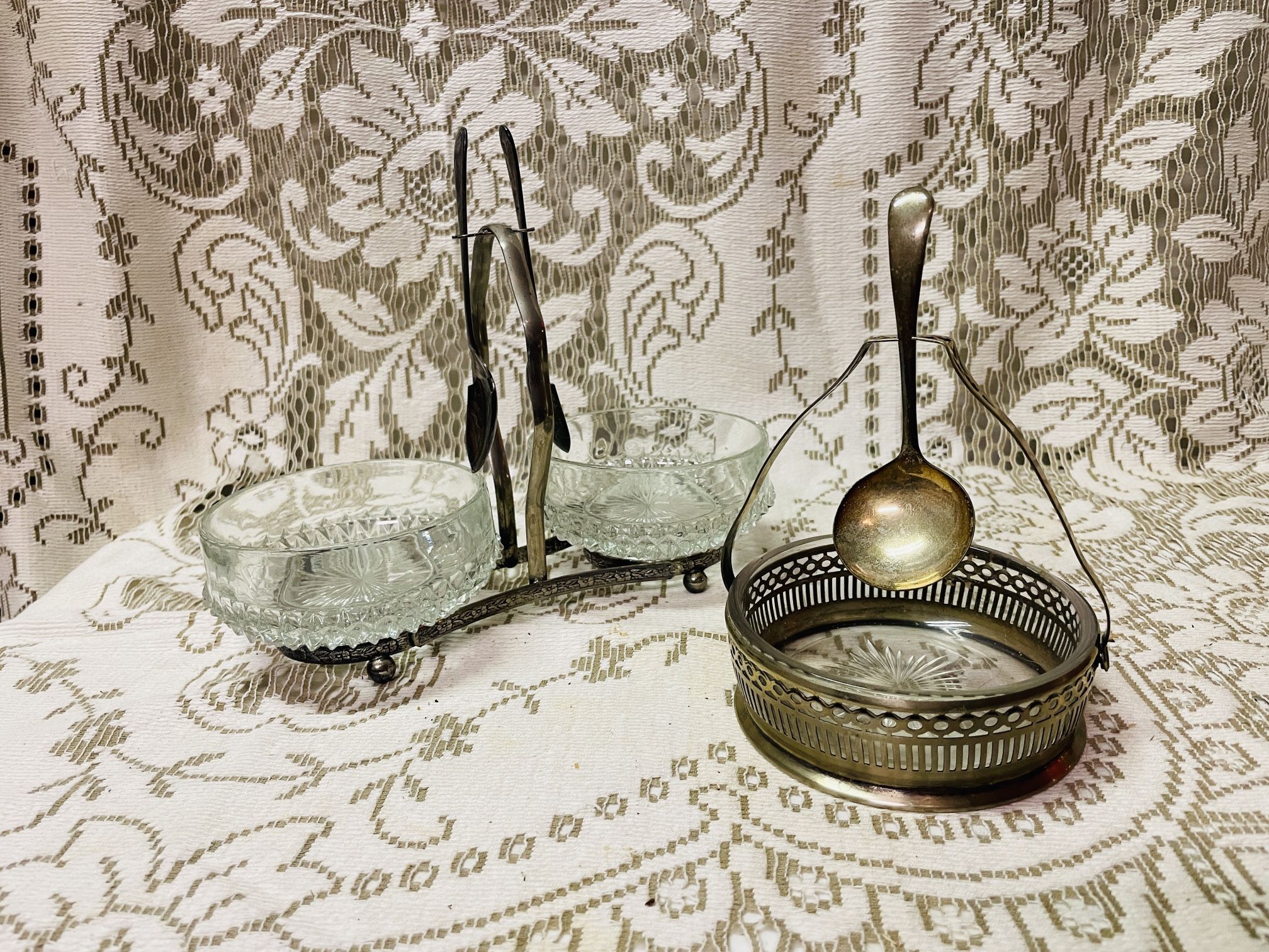 This is a vintage silver-plated condiment or relish serving dish set, featuring two removable glass bowls and small serving spoons in a pierced metal caddy with a handle. The set is often used for serving jams, nuts, or various condiments. The caddy and spoons are typically silver-plated. The glass bowls feature a pressed or cut glass design, which can be separated from the stand for cleaning. Similar items have been associated with brands like Queen Anne or Mayell & Co