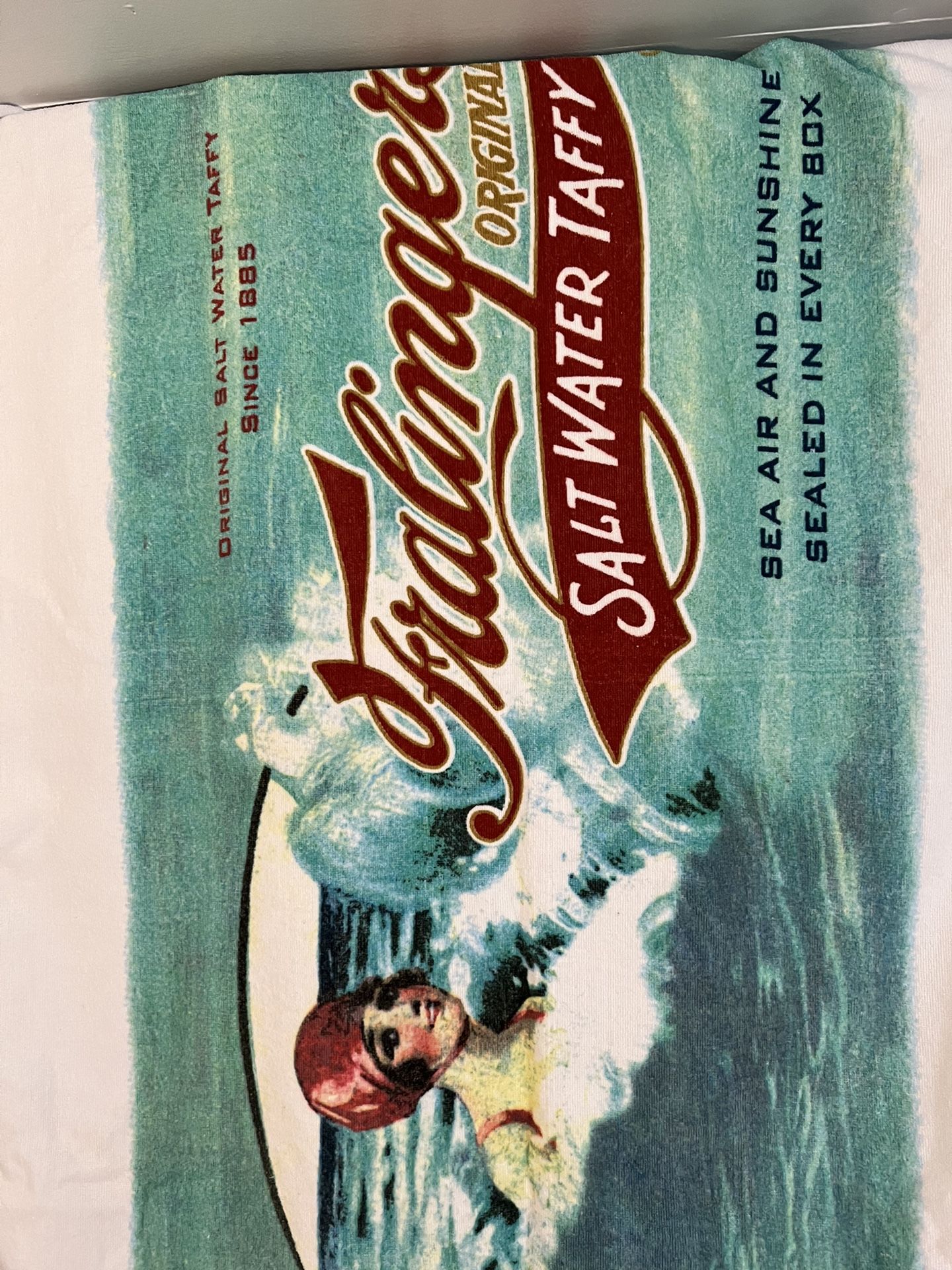 Large very vintage souvenir beach towel from Atlantic City’s famous saltwater taffy store