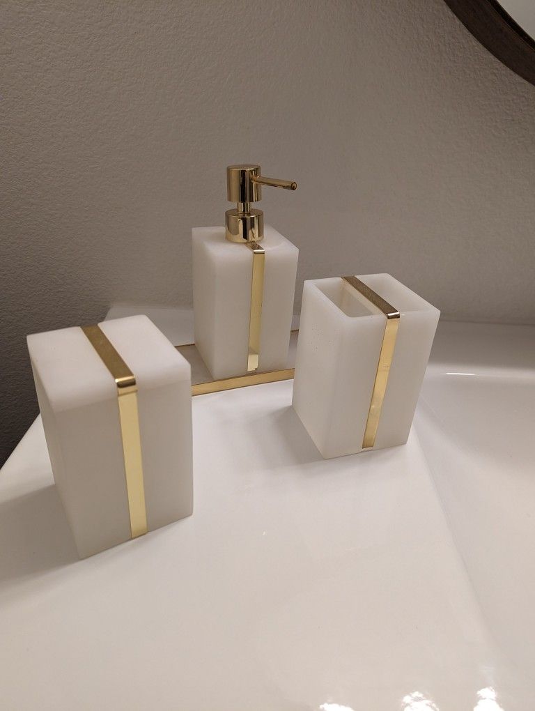 5 piece set. New! Purchased and Never used. Comes with - soap dispenser tissue box holder tooth brush holder container with lid(cotton, qtips etc..) Countertop tray