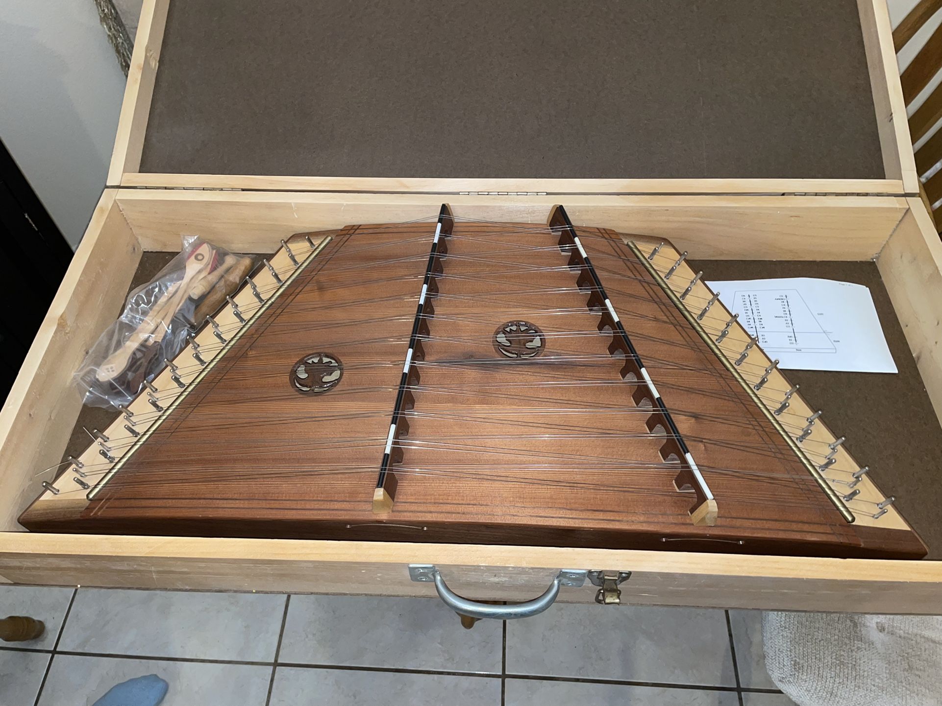 Gorgeous hammer dulcimer with case. Two sets of hammers included along with tuning wrench and peg to stand up.