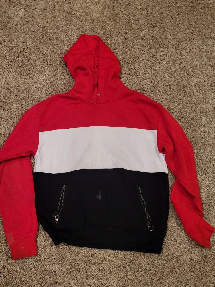 Men Med Zine red/white/black striped hooded pullover sweatshirt hoodie. Lot 17 Pick up 5 miles west of Janesville Can meet westside or southside Janesville