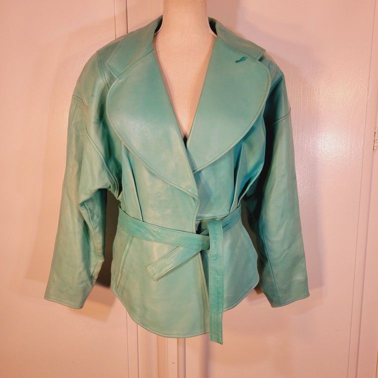 Just discounted 50% off! Extraordinary Leather Jacket, leather os like butta!! shoulder pads, belt tie and High waist Pleated Leather pants Looks tie dye. Amazing vintage π Jacket: Bust 42", Waist 34, Length 28 Pants; waist 25. Hips 40, inseam 30.5, length 42, front rise 13" Leather has faded in many areas Otherwise, amazing structure sturdy. No rips tears, etc