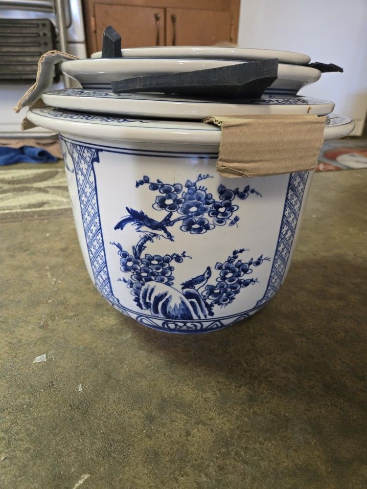 Beautiful blue and white painted scenes. 4 pots total: 10 in., 9 in., 8in., 7 in. Cash only