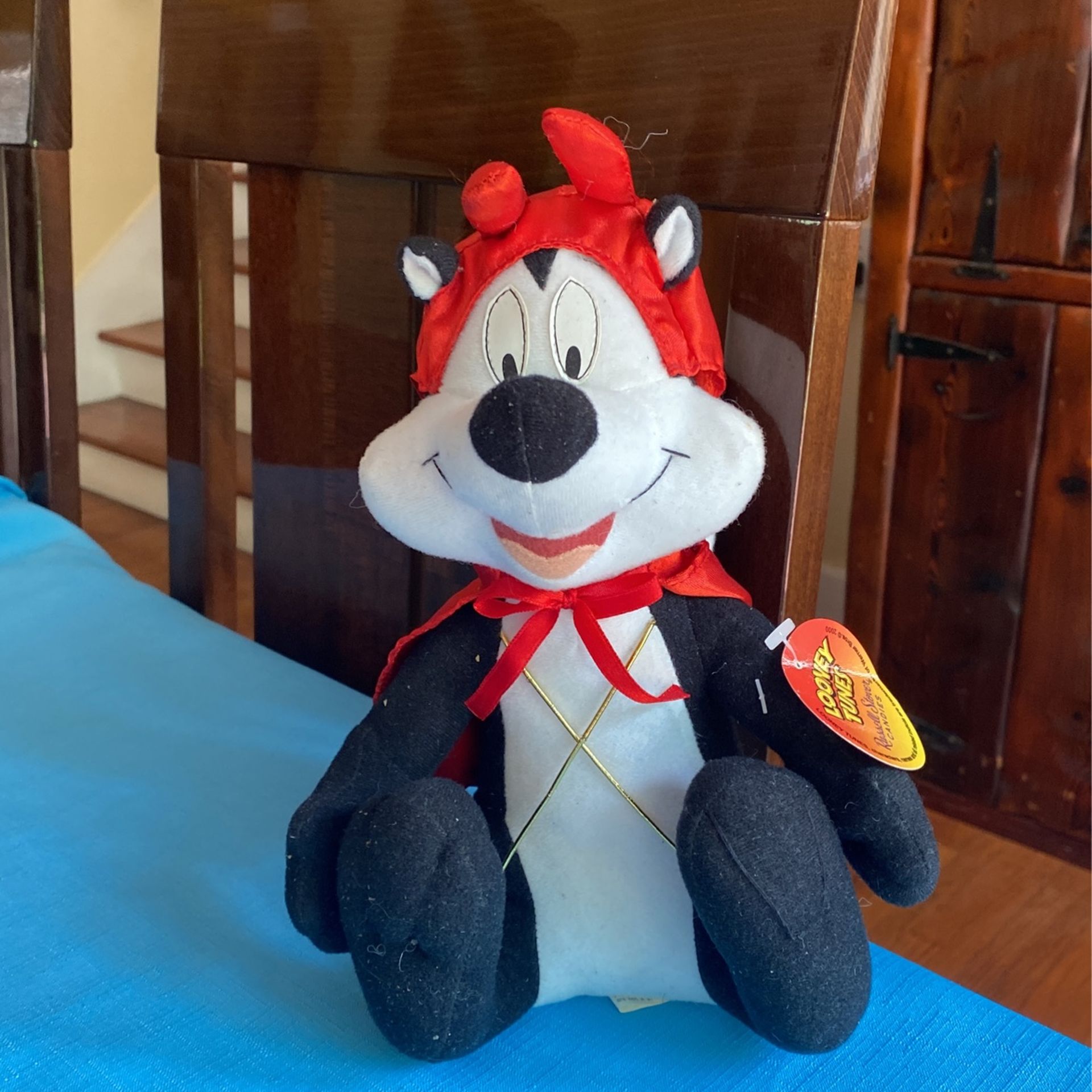 Looney Tunes vintage collectible Pepe le pew black and white stuffed animal skunk with red horns in cape as pictured. Normal wear otherwise has the original tags still. Great collectible item cartoon Looney Tunes