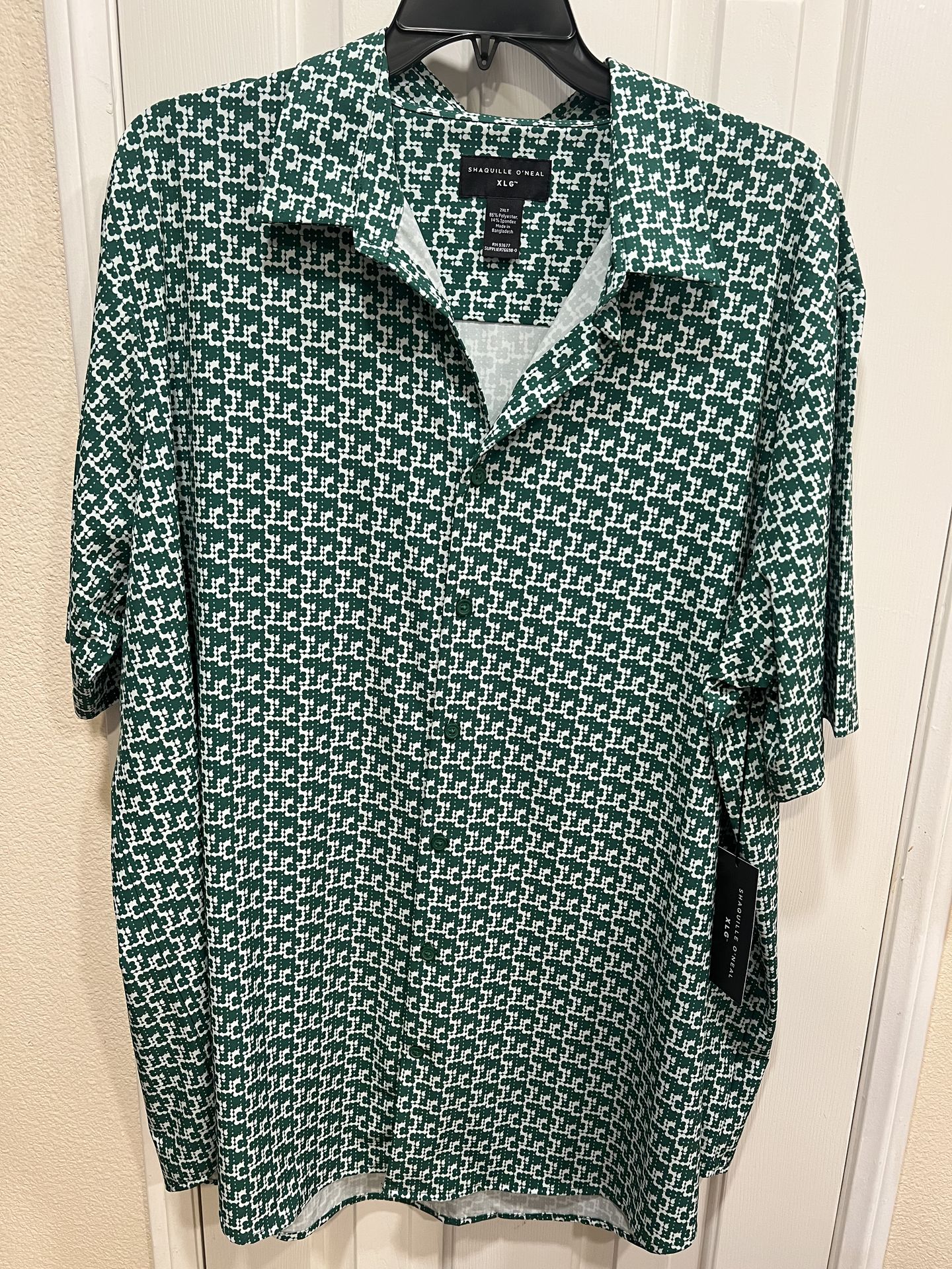Short-sleeve polo with an all-over green and white geometric print. Lightweight, breathable, and cool to touch for everyday wear. Modern collar and button placket for a polished look. Pairs easily with casual or dress pants. Retail $55. Size 2XLT
