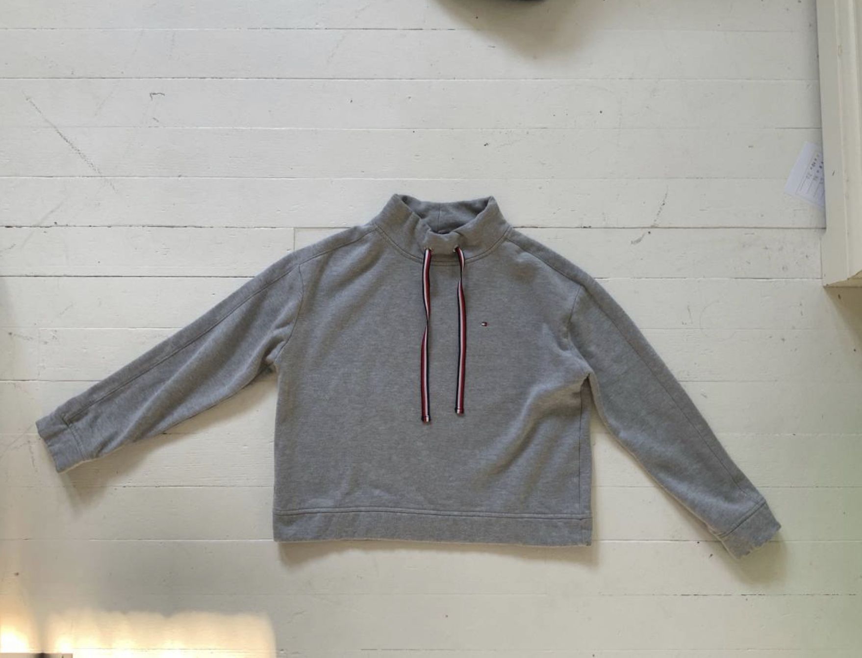Grey Tommy Hilfiger sweater. Size small. Turtleneck with drawstrings.