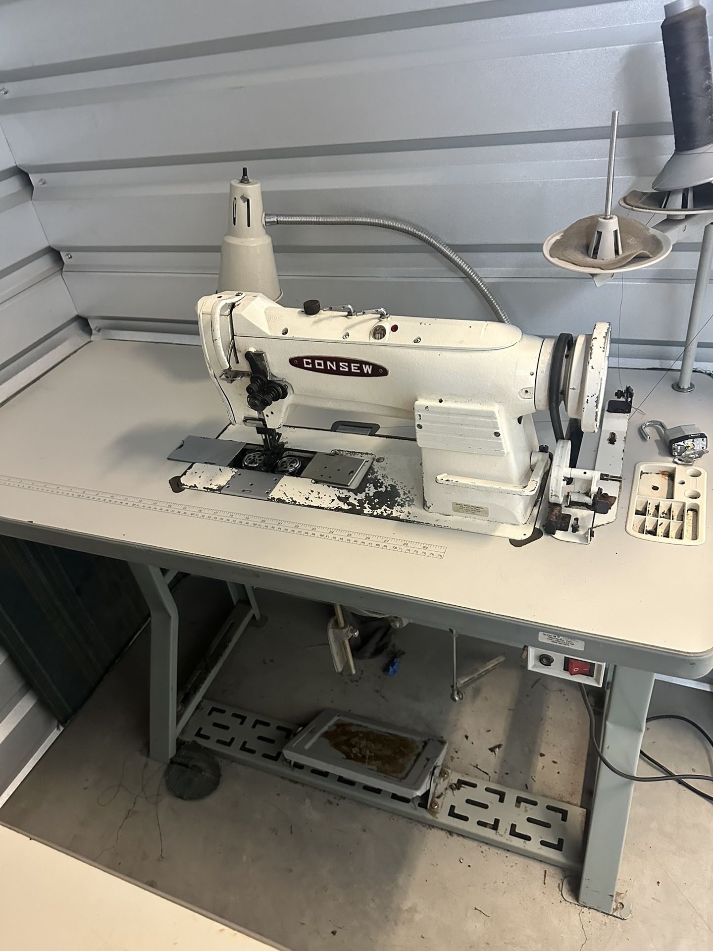 Consew double needle 339RB-2 gauge MACHINE SPECIFICATIONS: * Number of Needles: 2 (Double) * Feeding Mechanism: Walking Foot * Workspace: Standard Workspace * Standard or Full Function: Standard Functions * Speed, Max: 3000 Stitches per minute * Clearance Under Presser Foot: 9/16" (14mm) * Stitch Length: 2 1/2" s.p.i. (10mm) * Hook Size: Large * Work Space: 10" (258mm) * Needle: 135 x 17 * Bobbin Metal: 15041 * Pre-wound: S or U * Bed Size: 7" 20 3/8" (177mm x 518mm) * Stitch Type: 301 * Gross Weight: 97 lbs. (44 kgs.) * Needle Bar Stroke: 1 5/16" (33mm) * Available Needle Spacings: 1/8" (3.2mm) - 1 1/2" (38.1mm) * Standard Needle Spacing: 1/4" (6.4mm) * Hook: 15502 Consew 339RB-4 2 Needle Walking Foot Machine Comes With Table, Legs, Servo Motor and LED Lamp Heavy Duty, High Speed, Two Needle, Lockstitch Machine, Drop Feed, Needle Feed and Alternating (Walking) Presser Feet With: Centra-Lube Semi-Automatic Lubrication System, Large Vertical Axis Hooks and Bobbins, Reverse Feed, Safety Clutch
