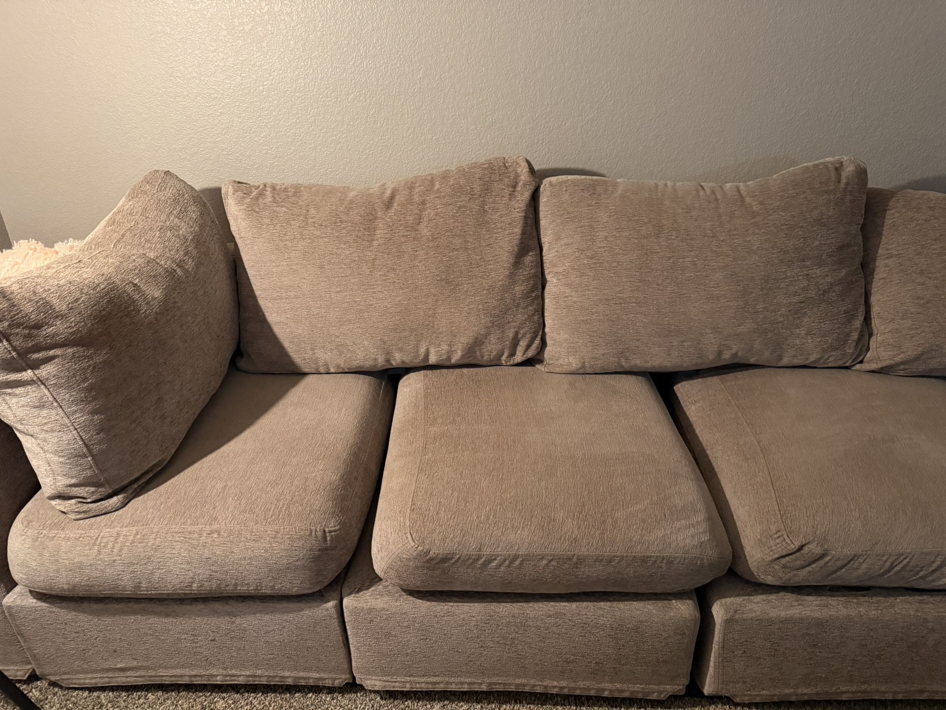 Measurements in last photo The fabric is really awesome. Fabric can be removed off every piece to be washed - including the fabric covering the bases. Has a textured look. Gray- Great for a smaller place Can be set up in different configurations Open to offers