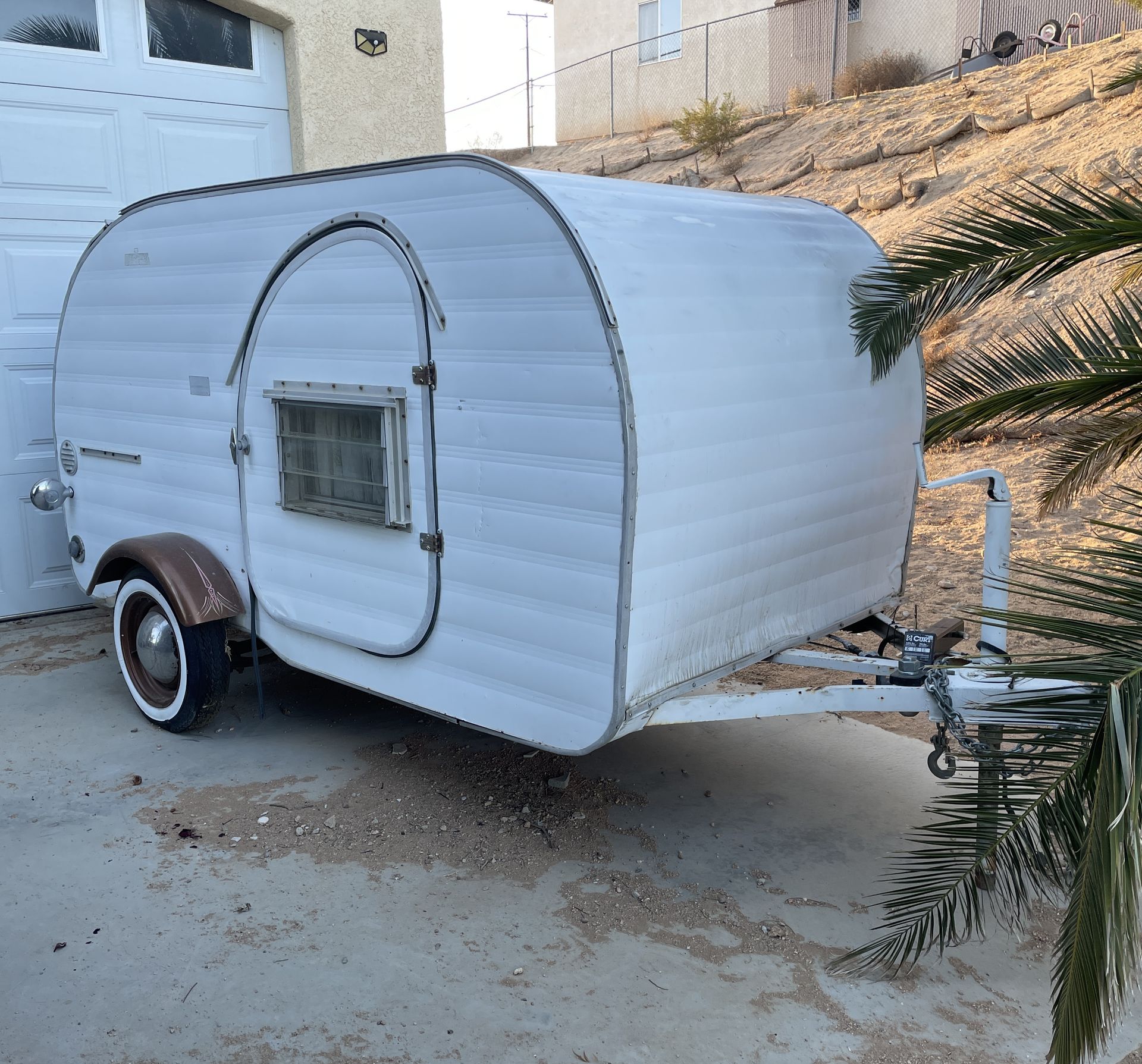 This is an original classic vintage 1964 Scad-A-Bout tear drop mini camper trailer. It has a stove, sink, water tank, ice box, and battery. We have the keys and title ready to go. It’s a bit dusty, but it is in overall good shape, and everything works well. It is 10ft long by 6.5ft wide, and 5ft tall. It weighs 1,385 pounds, so it can be towed by any car, truck or SUV.