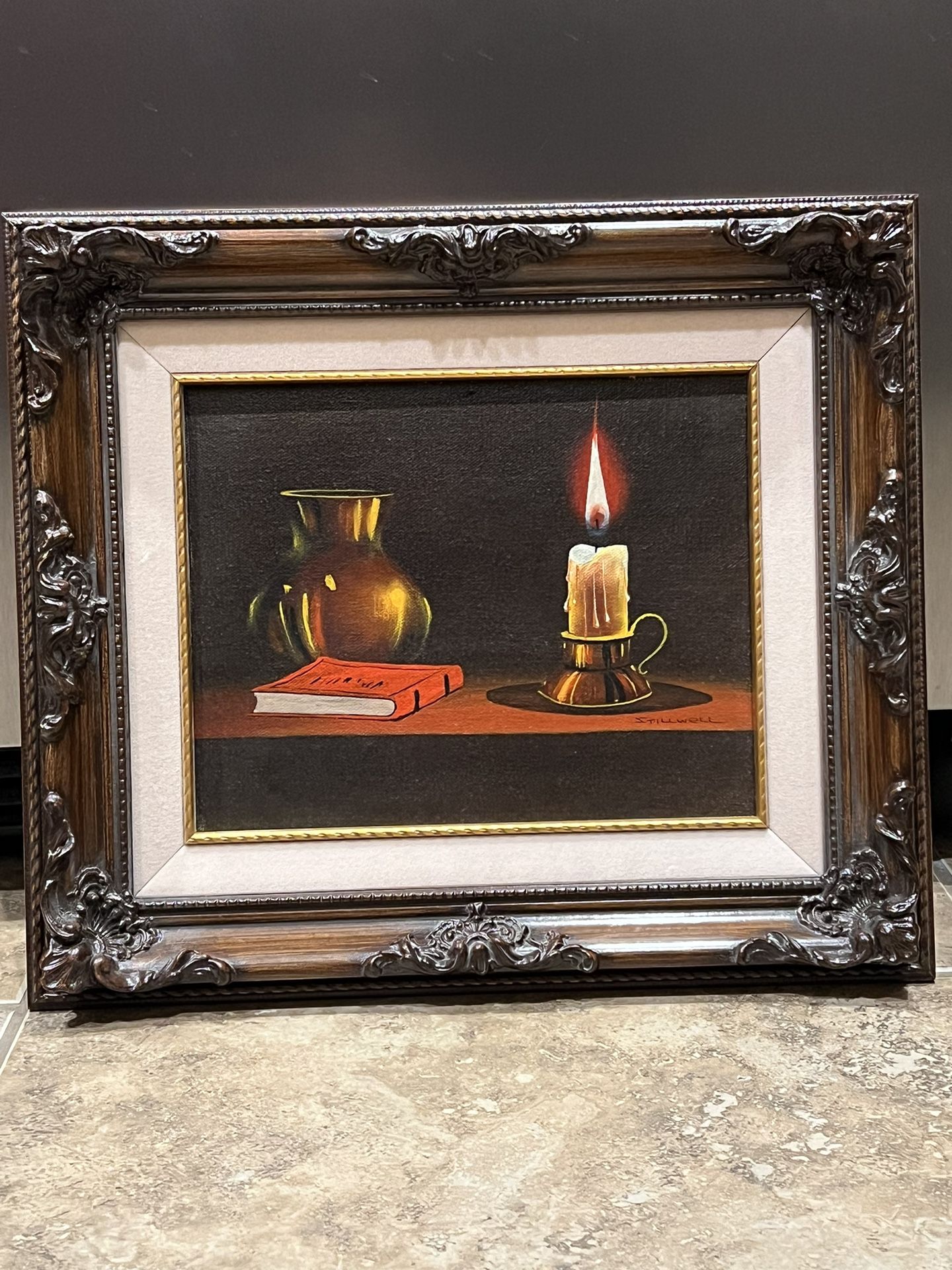 Vintage Stillwell still-life painting featuring a candle, book, and vase in a beautiful ornate carved frame. Classic, moody piece that would look great in an office, library, or traditional space. Frame alone is substantial and high quality. In great condition. Check out my other items.