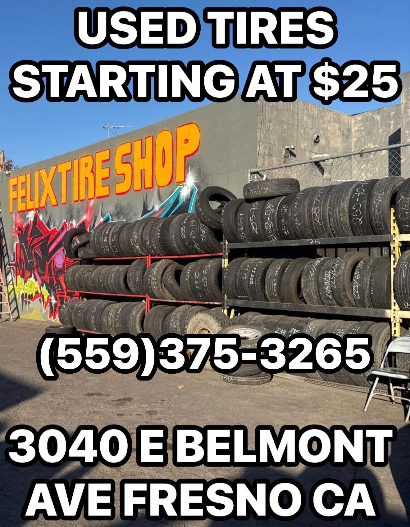 USED TIRES STARTING AT $25! NEW TIRES AT AFFORDABLE PRICES! 🙏👍 FELIX TIRE SHOP 3040 E BELMONT AVE FRESNO CA OPEN 10AM-6PM EVERYDAY LLANTAS USADAS EMPEZANDO EN $25! LLANTAS NUEVAS A PRECIOS ECONÓMICOS! 🙏👍 185/70R14, 185/50R20, 185/55R19, 185/60R14, 185/65R14, 185/65R15, 185/70R14, 195/50R15, 195/55R15, 195/60R14, 195/60R15, 195/65R14, 195/65R15, 195/70R14, 195/75R14, 205/40R16, 205/40R17, 205/45R16, 205/45R17, 205/50R15, 205/50R17, 205/55R15, 205/55R16, 205/60R15, 205/60R16, 205/65R15, 205/65R16, 205/70R14, 205/70R15, 205/75R14, 205/75R15, 215/35R19, 215/40R17, 215/45R17, 215/50R17, 215/55R16, 215/55R17, 215/60R16, 215/65R16, 215/65R17, 215/70R14, 215/70R15, 215/75R14, 215/75R15, 225/30R20, 225/30R26, 225/35R19, 225/35R20, 225/40R18, 225/40R19, 225/40R20, 225/45R17,225/45R18, 225/50R16, 225/50R17, 225/50R18, 225/55R16,225/55R17, 225/60R16,225/60R17, 225/65R16, 225/65R17,225/70R15,225/70R16, 225/75R15, 225/75R16,295/75R22.5, 11R22.5, 11R24.5, 285/75R24.5, 315/80R22.5,385/65R22.5, 425/65R22.5, 445/50R22.5, 255/70R22.5, 275/80R22.5 Toyo, Bridgestone, Michelin, Firestone, Falken, Pirelli, Goodyear, Wrangler, Kumho, Yokohama, Americus, Delinte, BFGoodrich, Americus, Delinte, Westlake, Ironman, Arroyo, Atlas, Thunderer, Lionhart, Antares, Crosswind, Radar, Achilles, Kenda, Milestar, Fortune, RoadOne, TBB